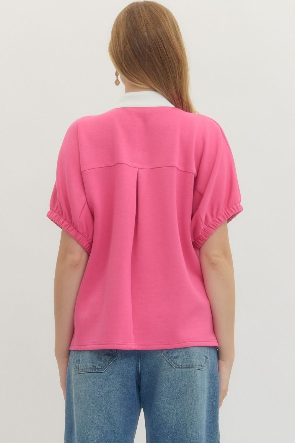 Refined simplicity meets thoughtful detail in this solid short sleeve knit top. The contrast trim at the V-neckline and collar creates a polished, preppy-inspired finish, while elasticated cuffs add a subtle touch of structure. Crafted from a lightweight knit blend, this piece offers effortless comfort with a put-together look.