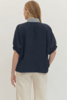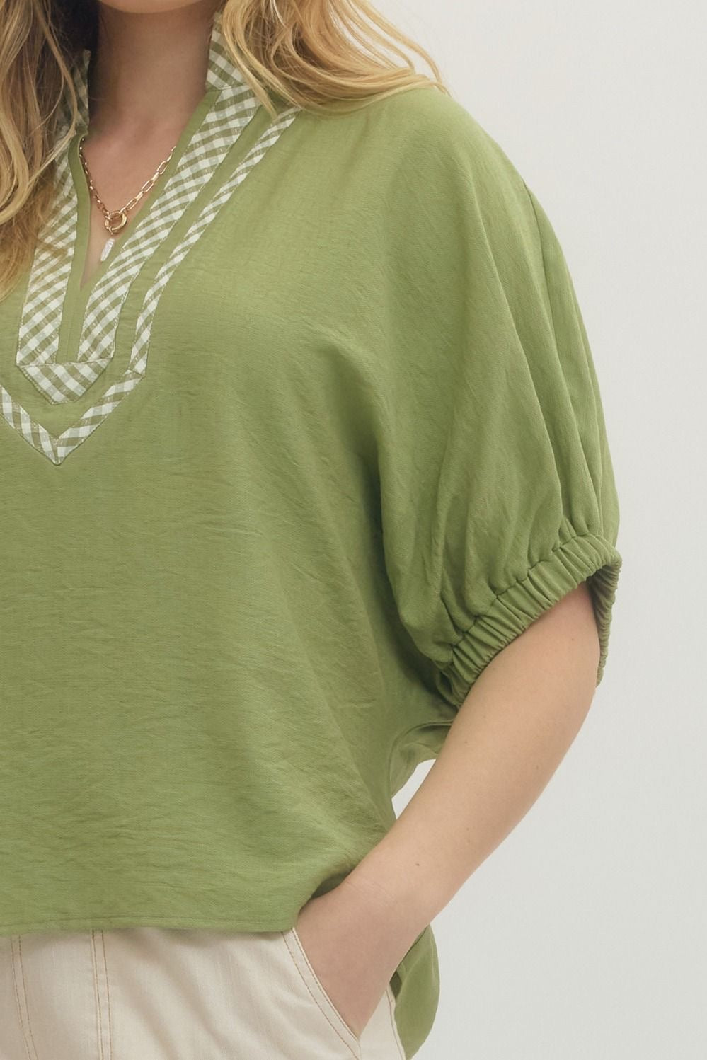 Effortless comfort with a touch of detail 🤍 This solid dolman top features a flattering V-neckline with a collared plaid trim for subtle contrast. Designed with elastic around the armholes and an intentionally loose, flowy fit, it drapes beautifully for all-day comfort while keeping a polished look.