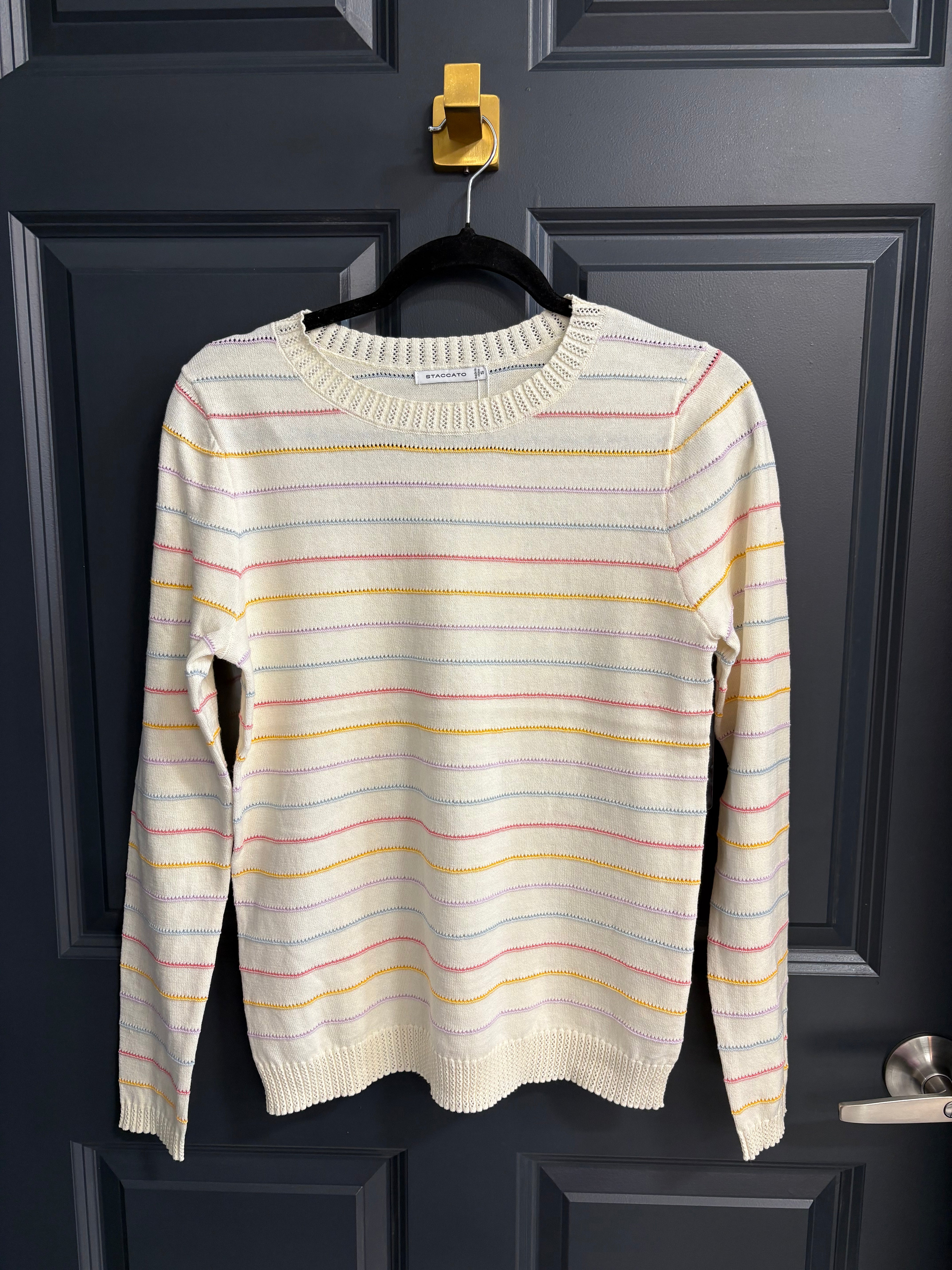 Soft texture meets playful color 🤍 This pointelle knit sweater features multi-color stripes, a classic crew neckline, and long sleeves for an easy, elevated everyday look. Crafted from breathable cotton, it offers lightweight comfort with just the right amount of detail to stand out.
