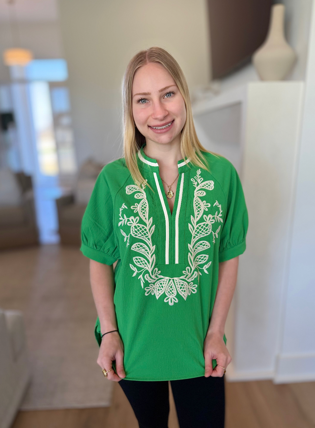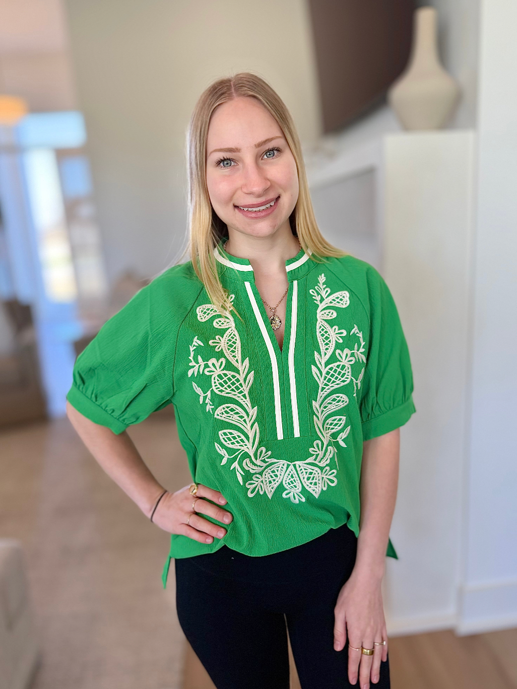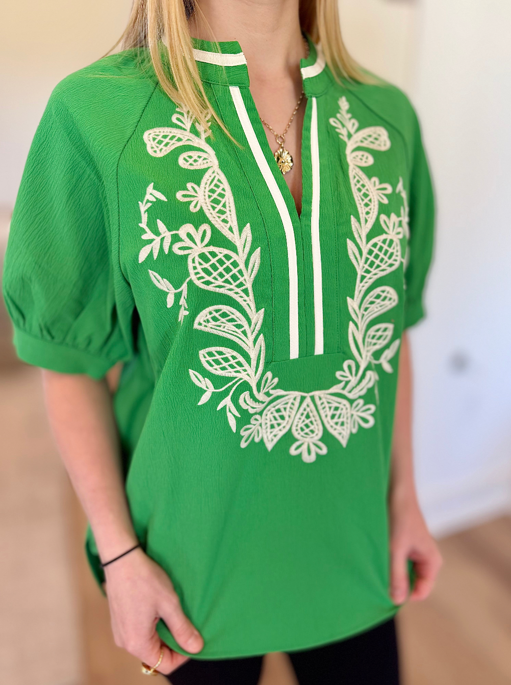 Puff Sleeve V-Neck Top with White Embroidery