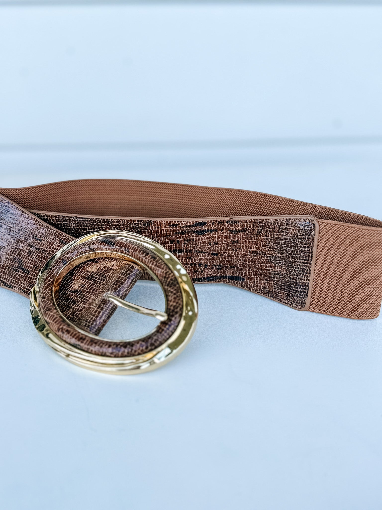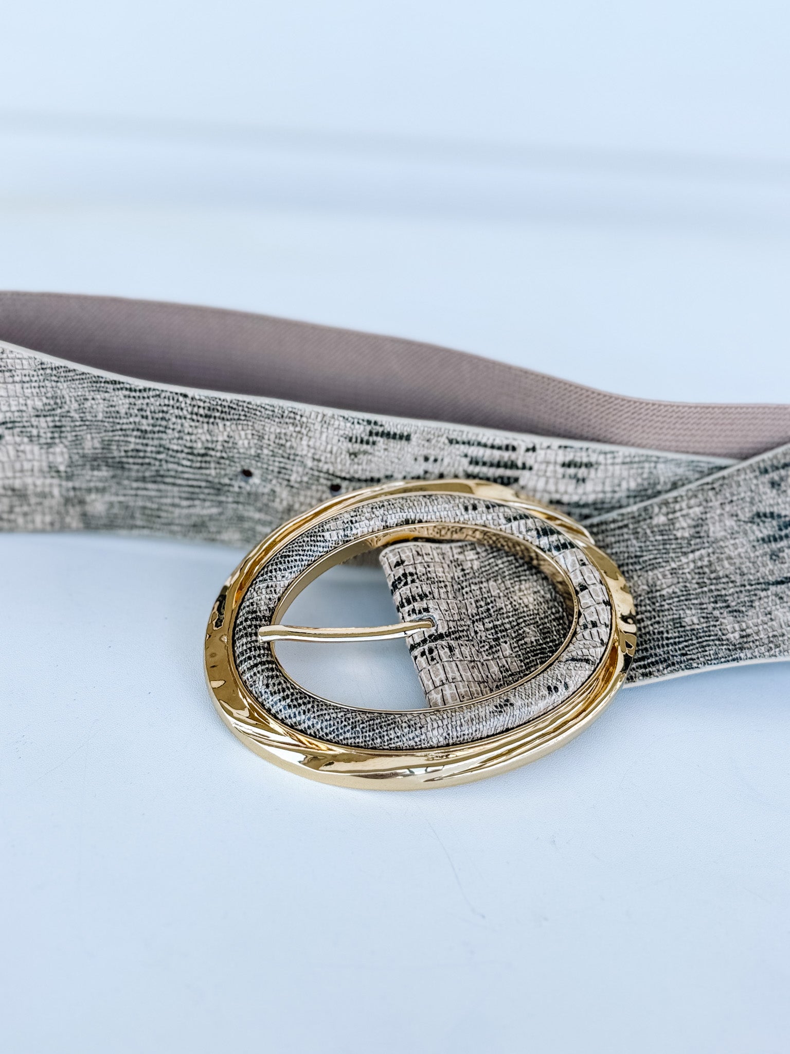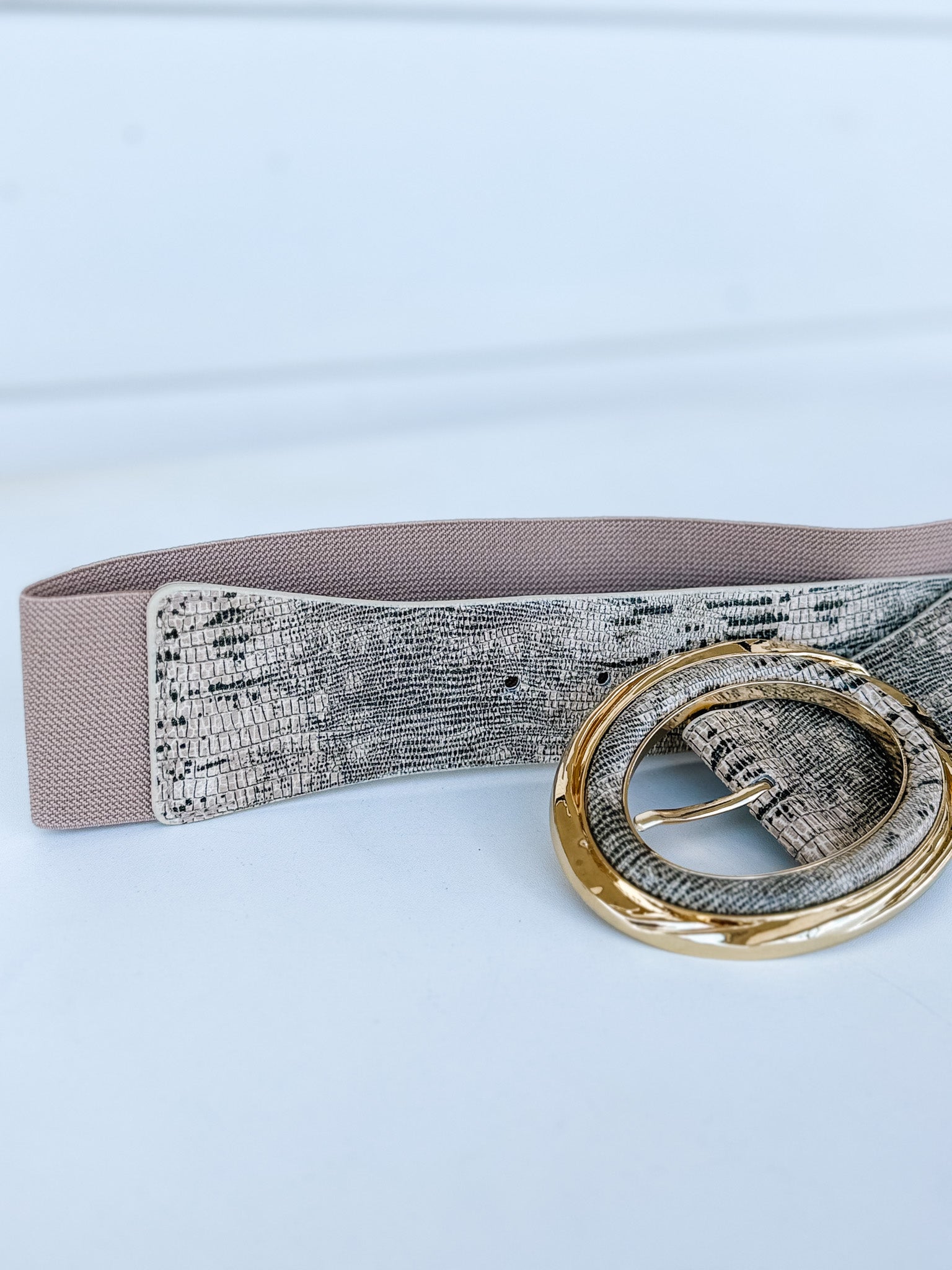 Sleek, bold, and effortlessly chic—this 2.5-inch wide stretch belt features a luxe snake skin finish and a statement-making oversized gold buckle. Designed to define the waist with comfort and style, it’s the perfect piece to add an edge of sophistication to dresses, jumpsuits, or tailored layers.
