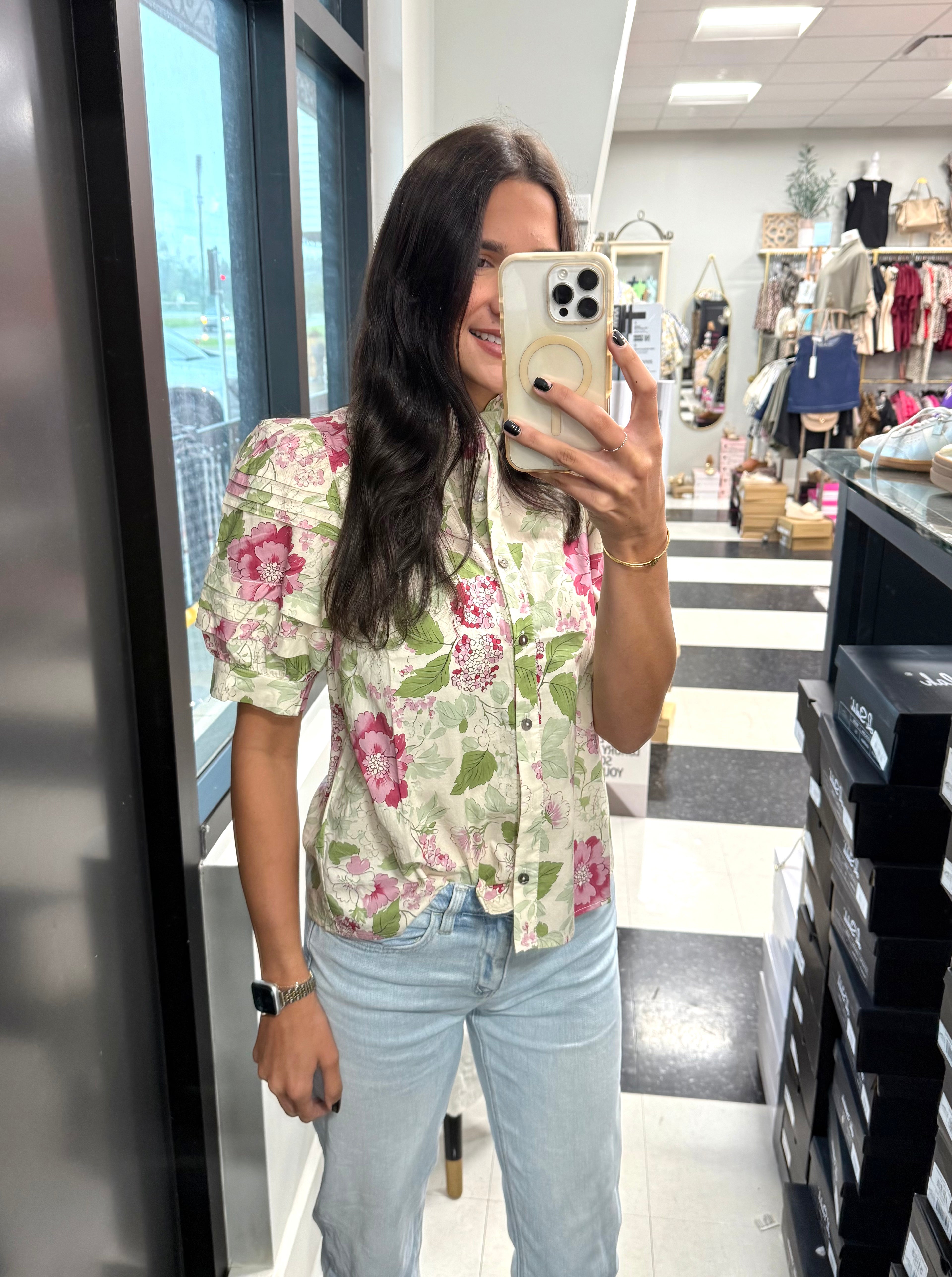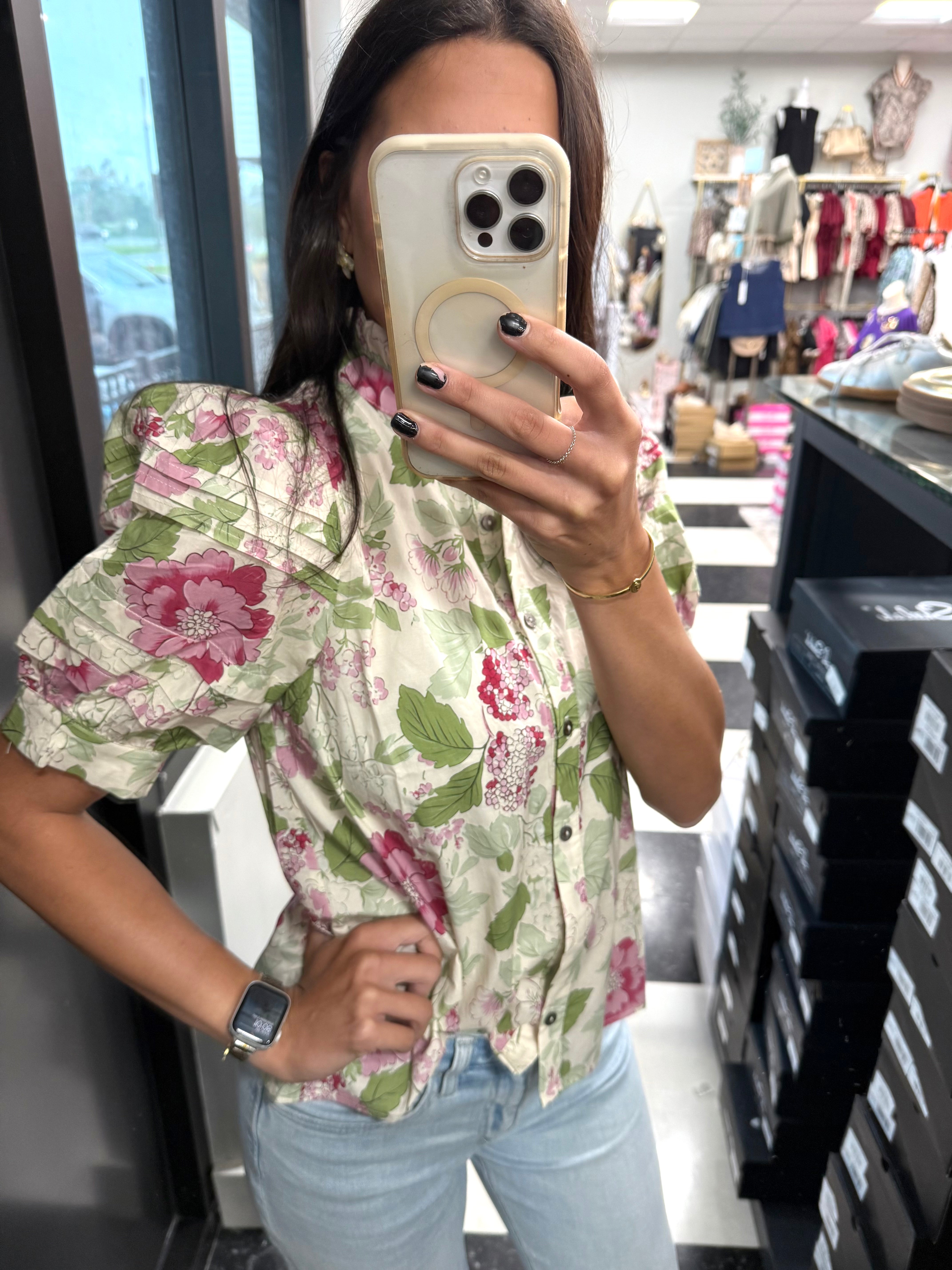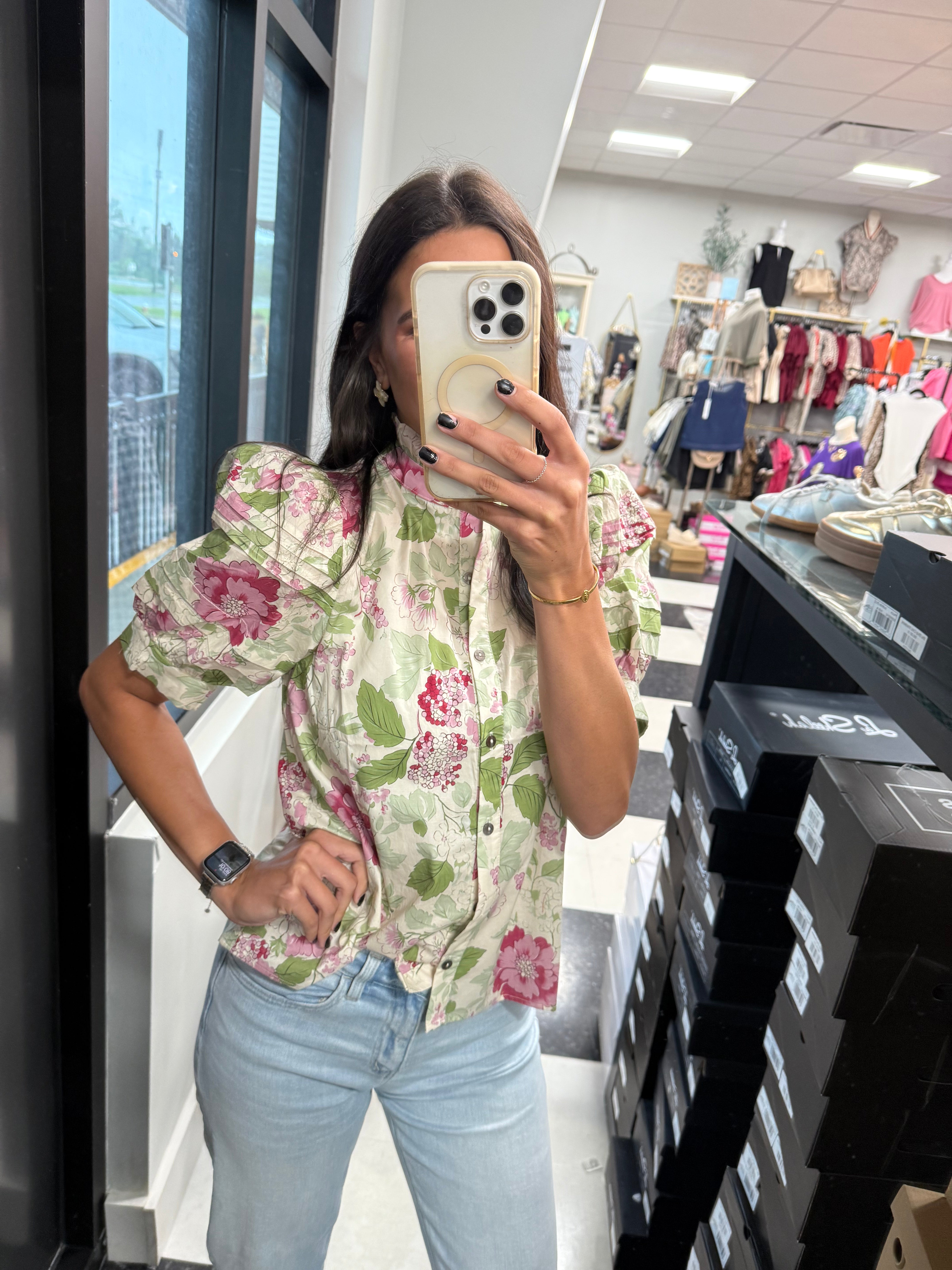 Elevate your wardrobe with this Floral Soft Touch Top, featuring a delicate floral print and elegant short puff sleeves with pintuck detailing. The mock neck and button-front closure add refined charm, while the lightweight woven fabric ensures comfort without sheerness. Unlined for a natural fit, this top blends sophistication with effortless style.