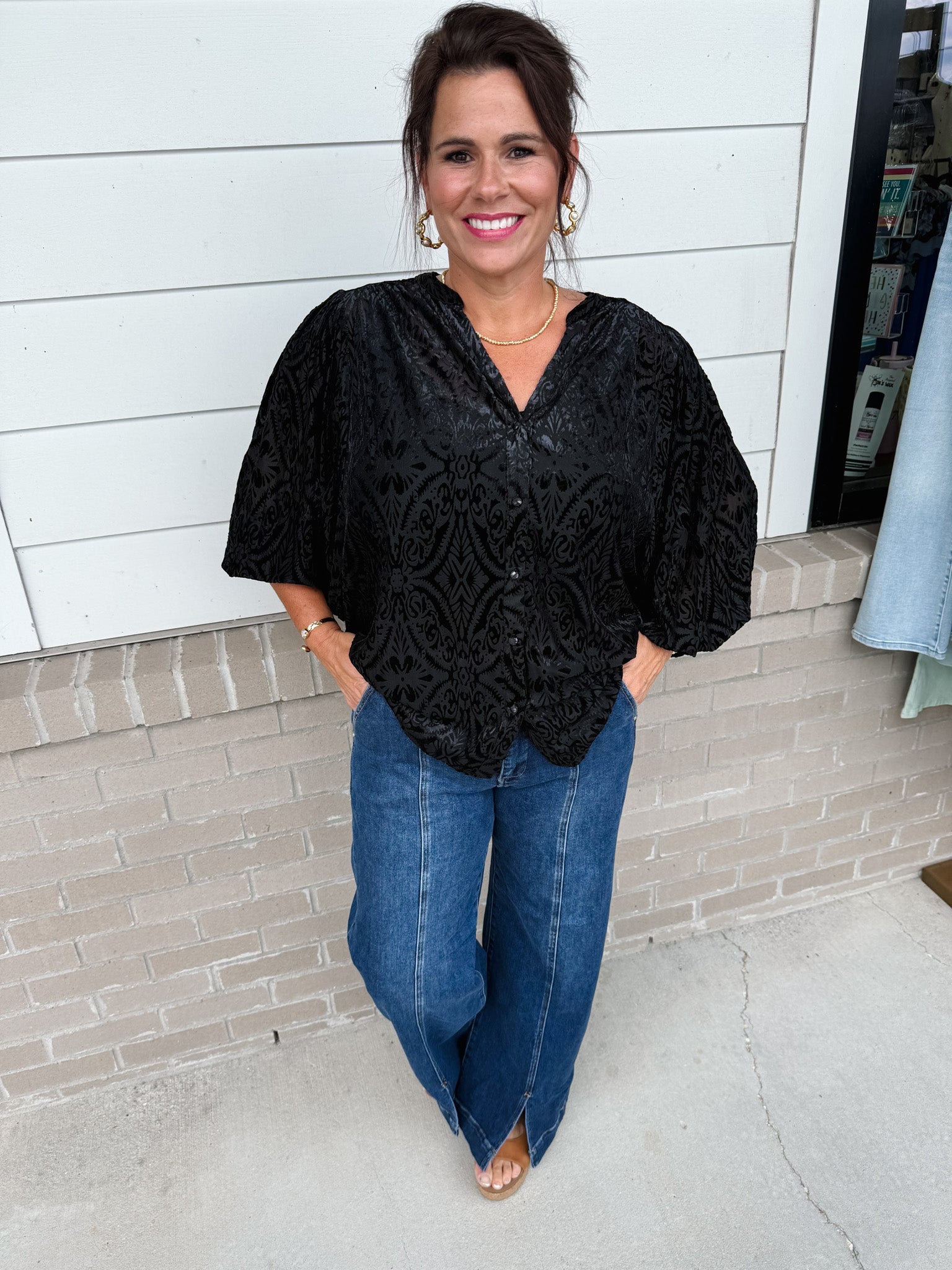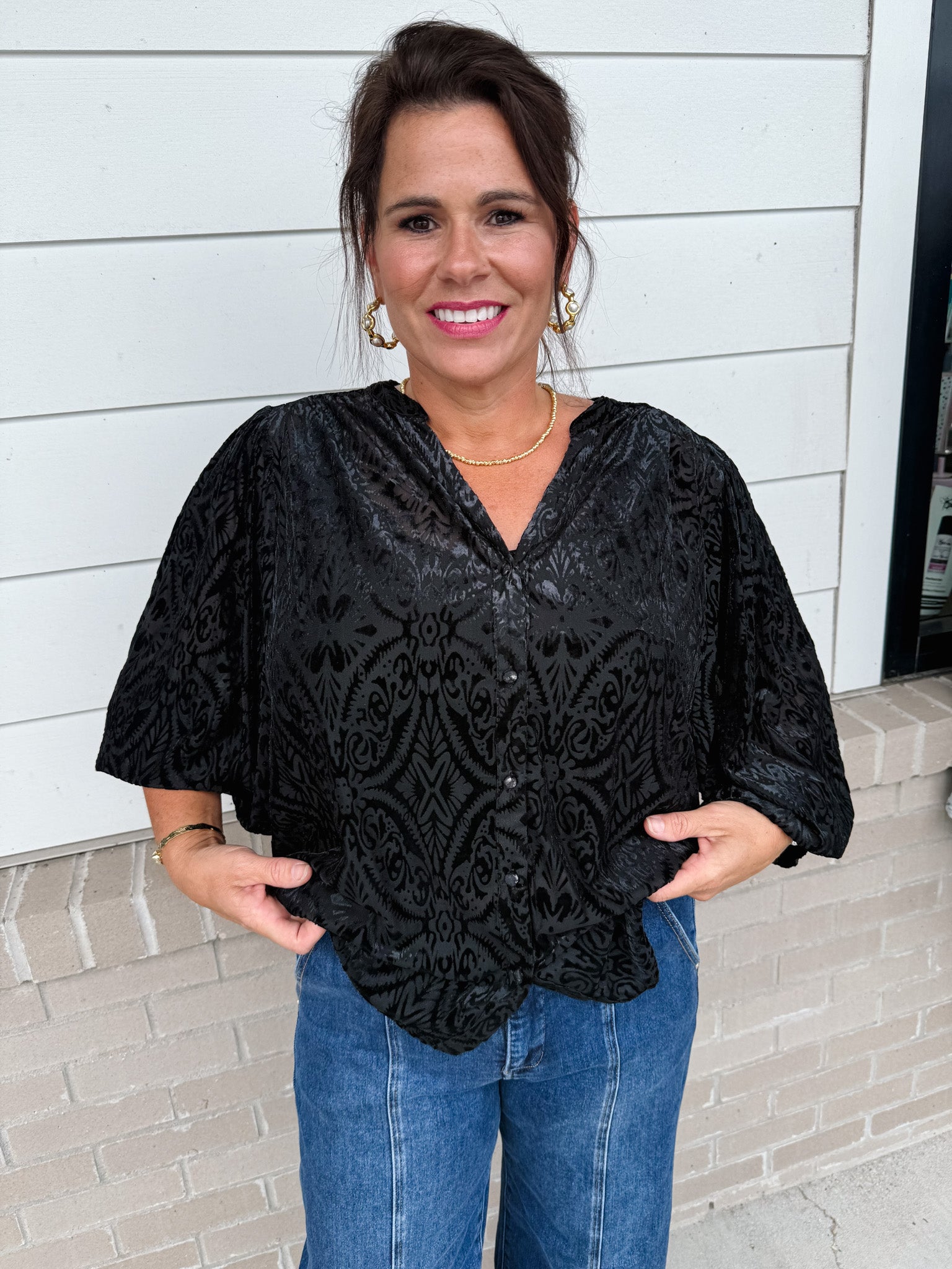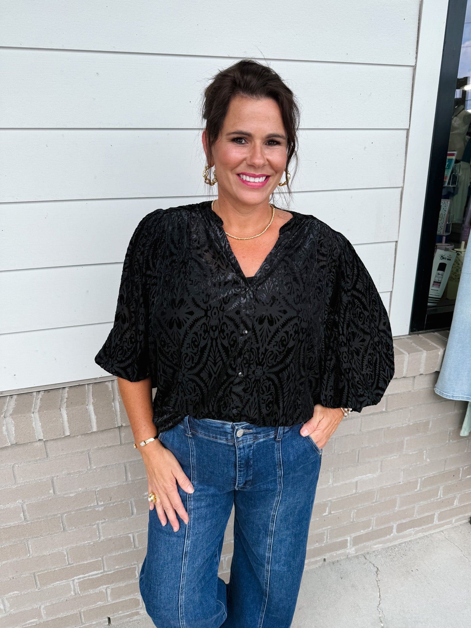 Elevate your wardrobe with the Umgee Around The Block Top, crafted from luxurious burnout velvet for a refined texture. Its long balloon sleeves and soft-collared V-neck create an elegant silhouette, while subtle pearl-style buttons add a delicate touch. Designed without lining, this top offers a lightweight, graceful fit perfect for sophisticated occasions.