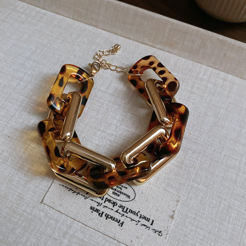 Crafted with durable acrylic tortoiseshell and polished gold accents, this bracelet is lightweight yet bold. The interlocking rectangular links offer a modern twist on a classic design, secured with a lobster clasp for all-day wear.