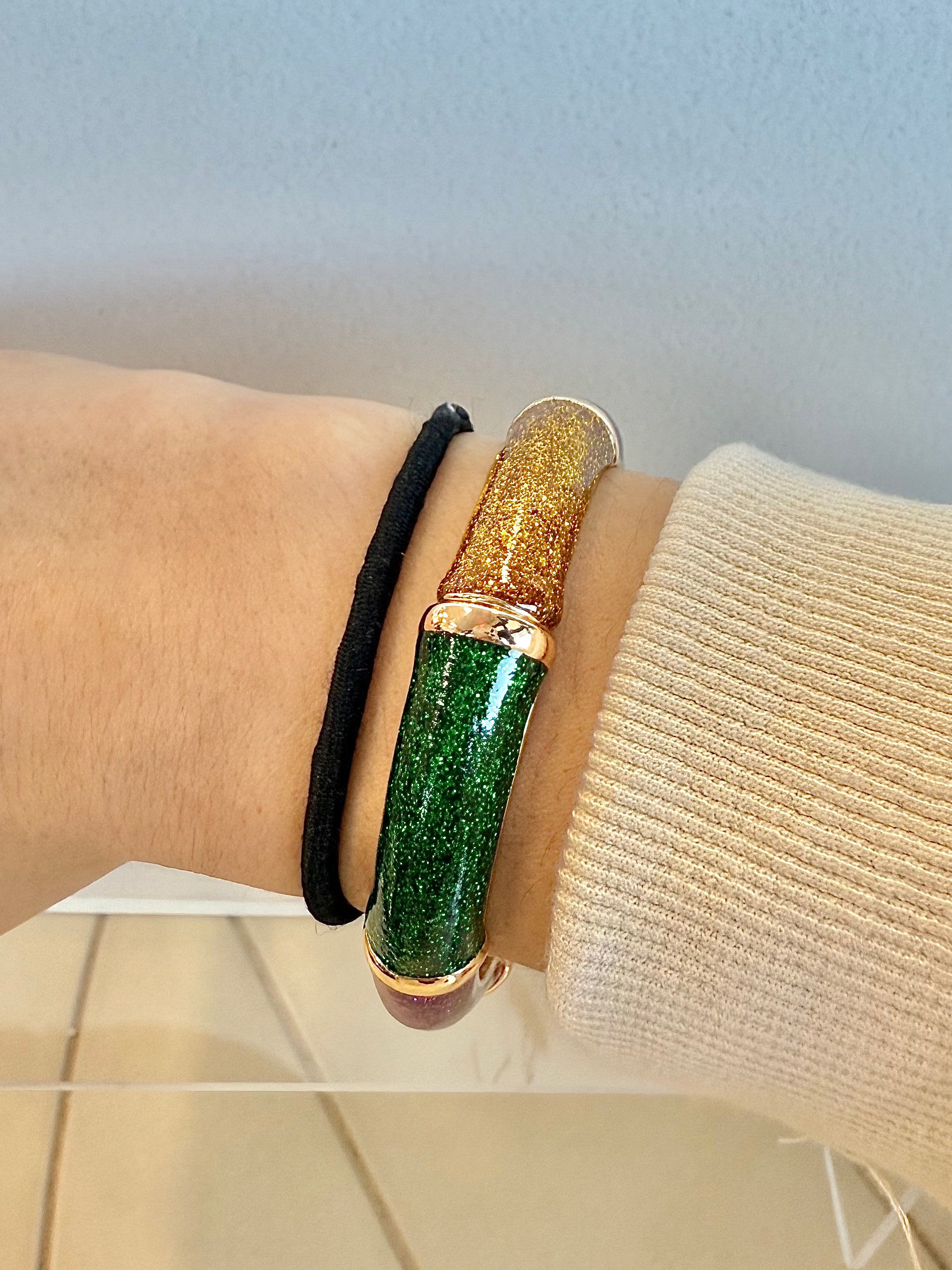 Celebrate in style with this vibrant round enamel bangle! Measuring 7.25 inches in diameter, it features dazzling Mardi Gras-inspired colors and sparkling glitter accents for a festive, eye-catching finish. Perfect for stacking or wearing solo, this bangle adds a playful pop to any outfit.