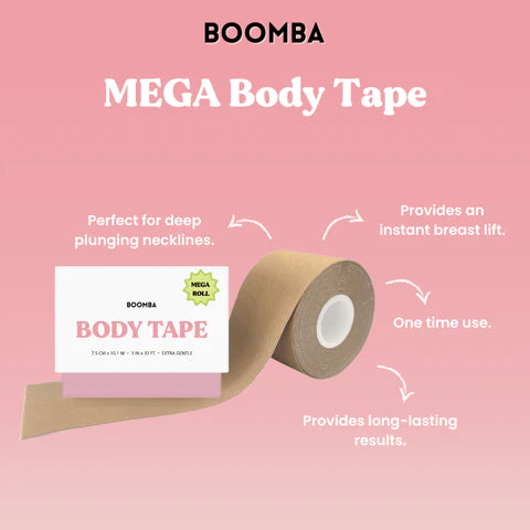 BOOMBA's Mega Body Tape can be worn in various ways. Designed to contour with your shapes, our body tape is gentle yet strong, providing long-lasting results for up to 12 hours.