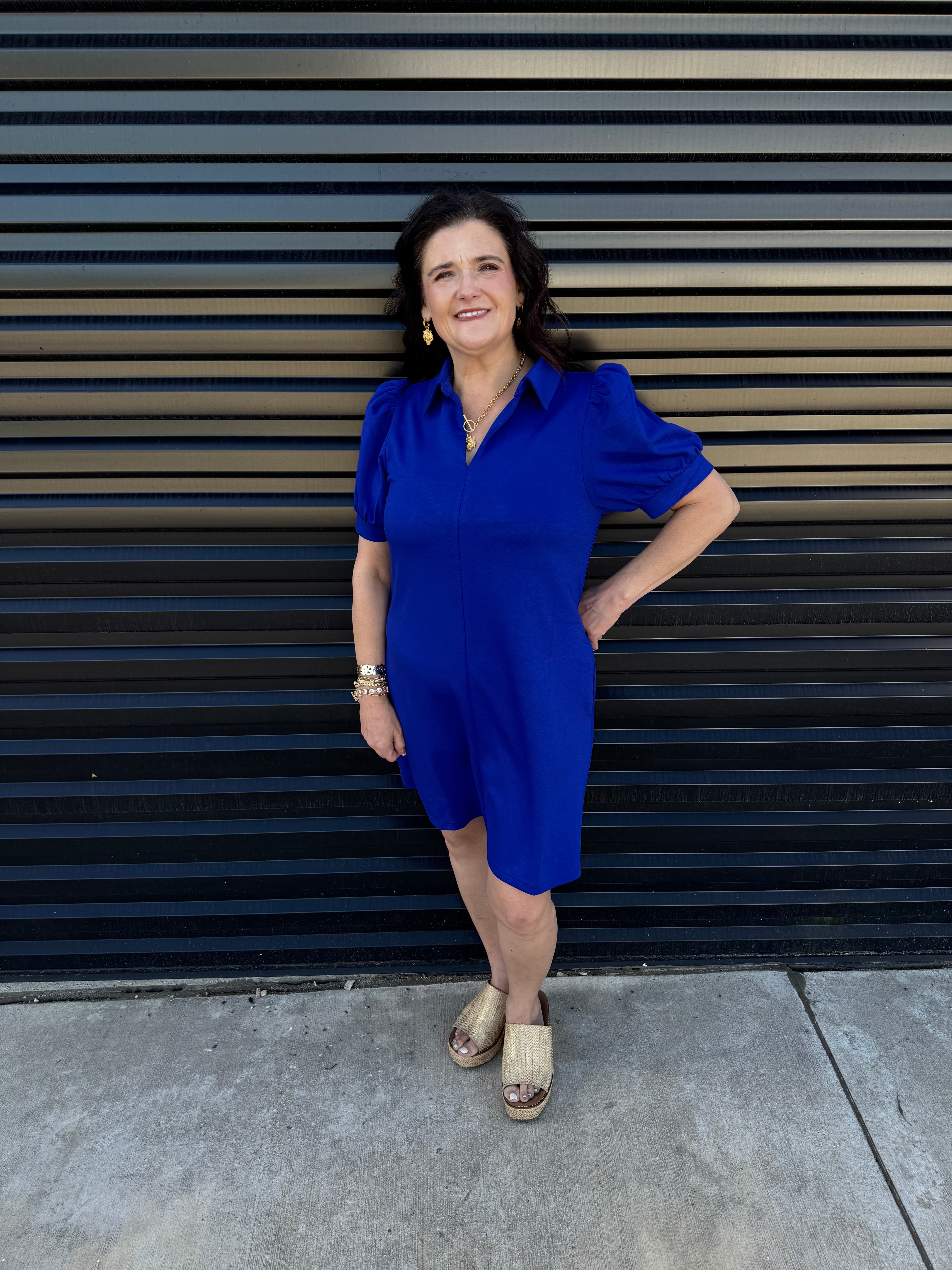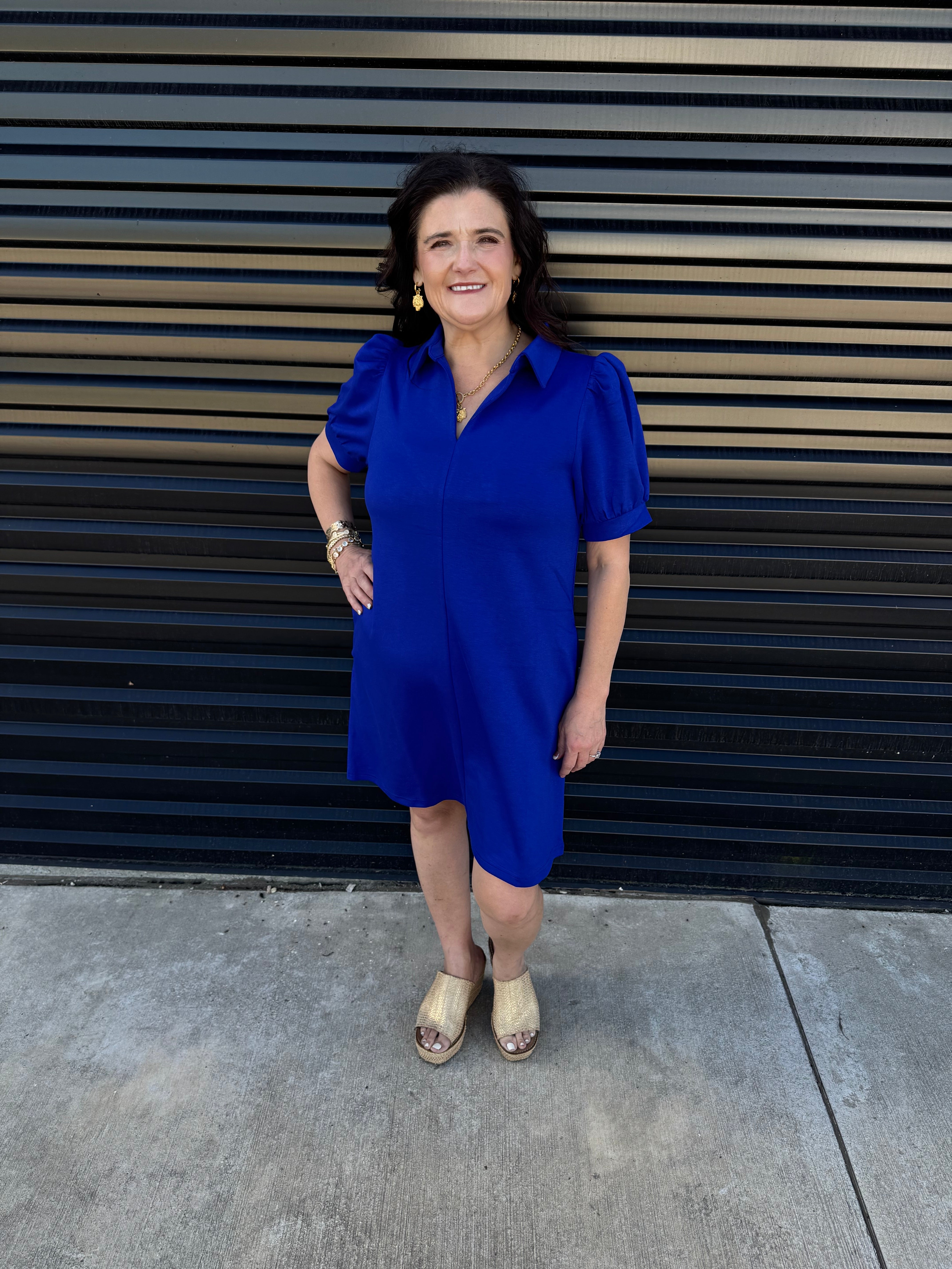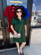 The Collared Autumn Whisper Dress combines effortless elegance with practical design. Crafted from lightweight, non-sheer jersey fabric, it features an open collared neckline and puffed short sleeves with refined band cuffs. Side pockets add subtle functionality, making this dress a sophisticated choice for comfortable, stylish wear throughout the season.