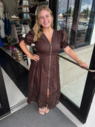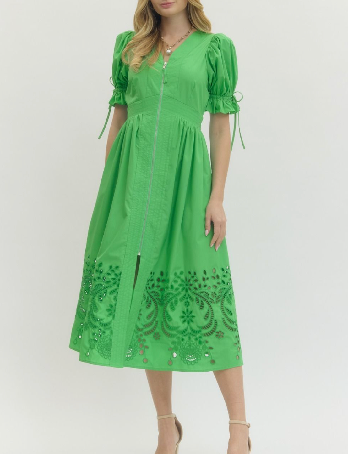 This elegant midi dress showcases a solid design with short puff sleeves and a flattering stitch-accented V-neckline. The smocked waistband at the back enhances the silhouette, while the embroidered skirt hem adds a refined touch. Crafted from lightweight woven fabric, it features a front zipper closure and a fully lined, non-sheer construction for comfortable wear. Perfect for sophisticated occasions, this dress combines classic details with modern tailoring.
