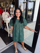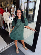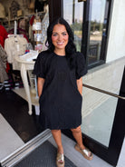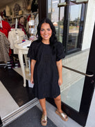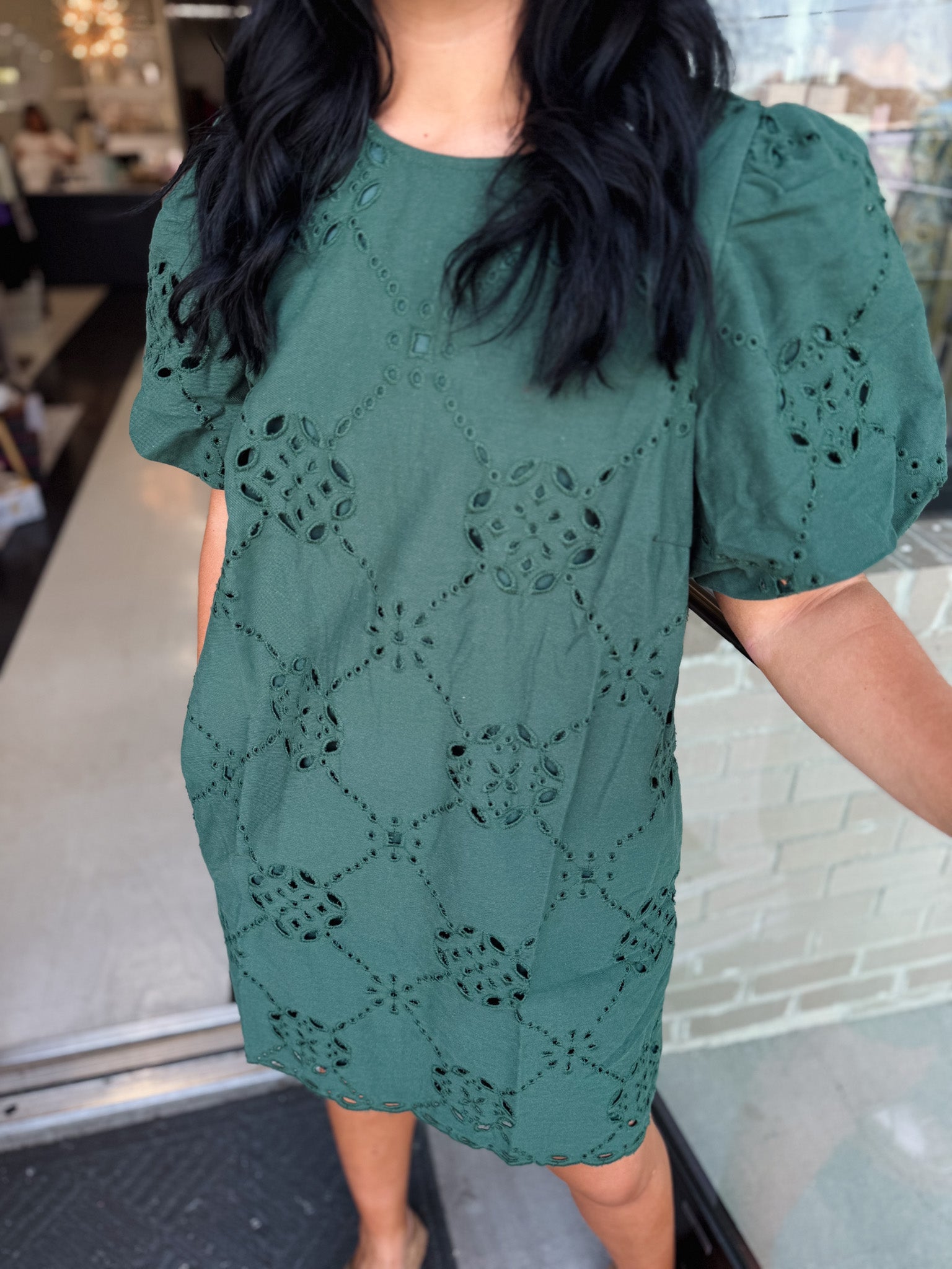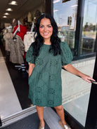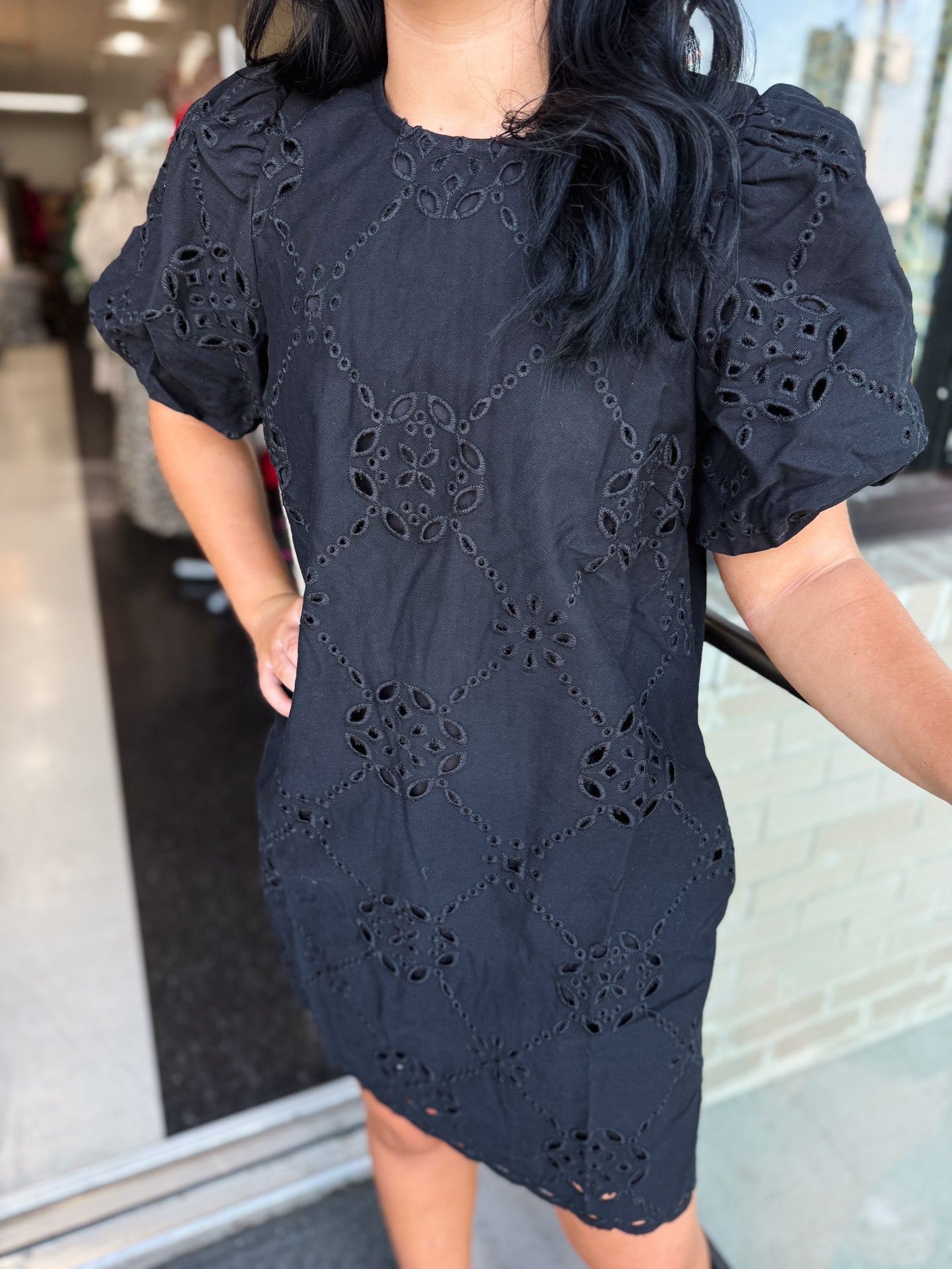 This sophisticated mini dress blends delicate eyelet embroidery with a flattering puff sleeve design. The scalloped hem adds a refined touch, while the side pocket and back zipper ensure both style and practicality. Lightweight, fully lined, and crafted from woven fabric, the dress offers comfort without transparency, making it ideal for elegant day or evening wear.