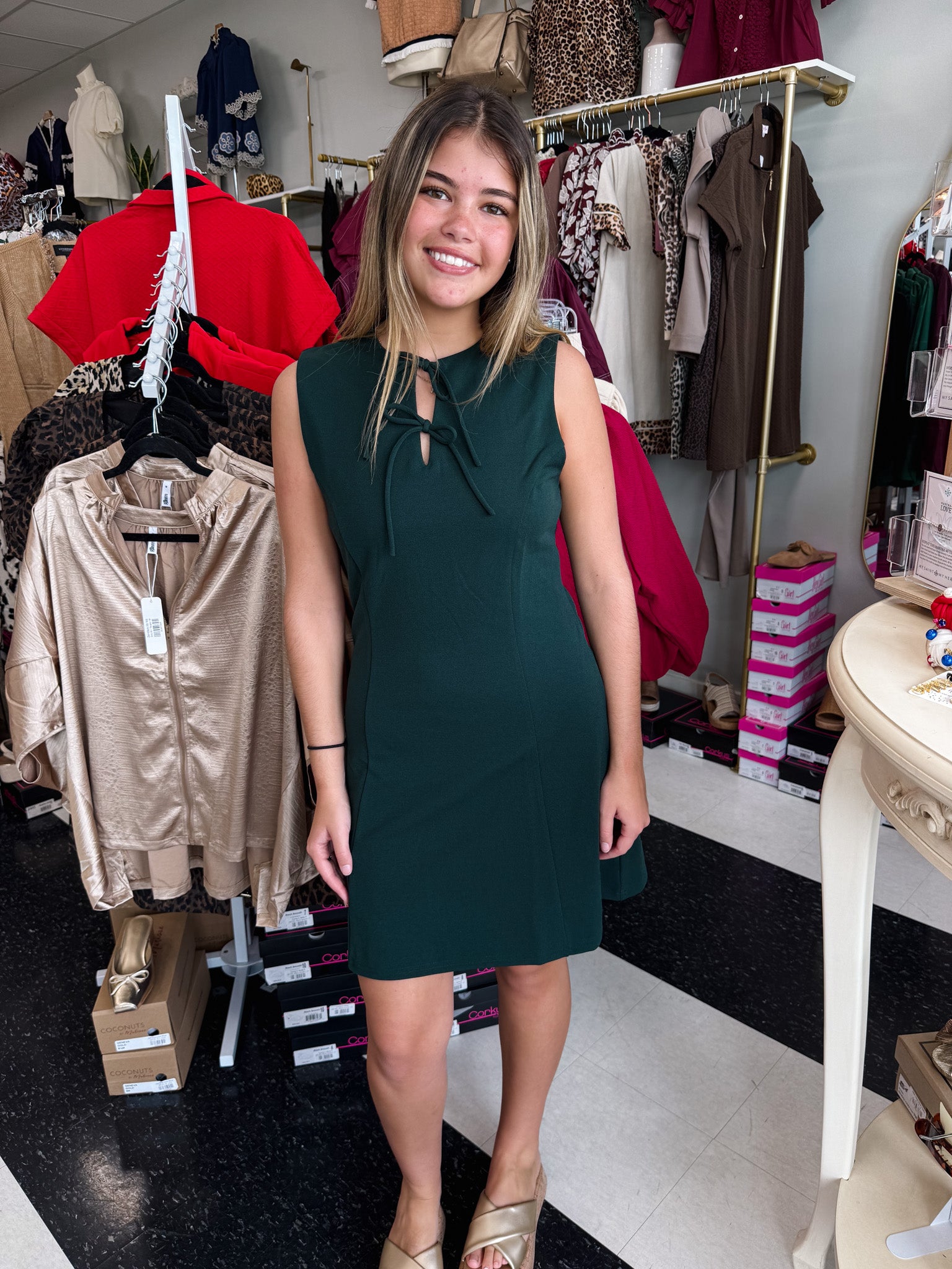 This sleeveless heavy knit mini dress combines refined texture with elegant design, featuring a delicate bow detail that adds a touch of sophistication. Fully lined for comfort and structure, it offers a flattering silhouette perfect for upscale occasions or stylish evening wear.