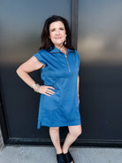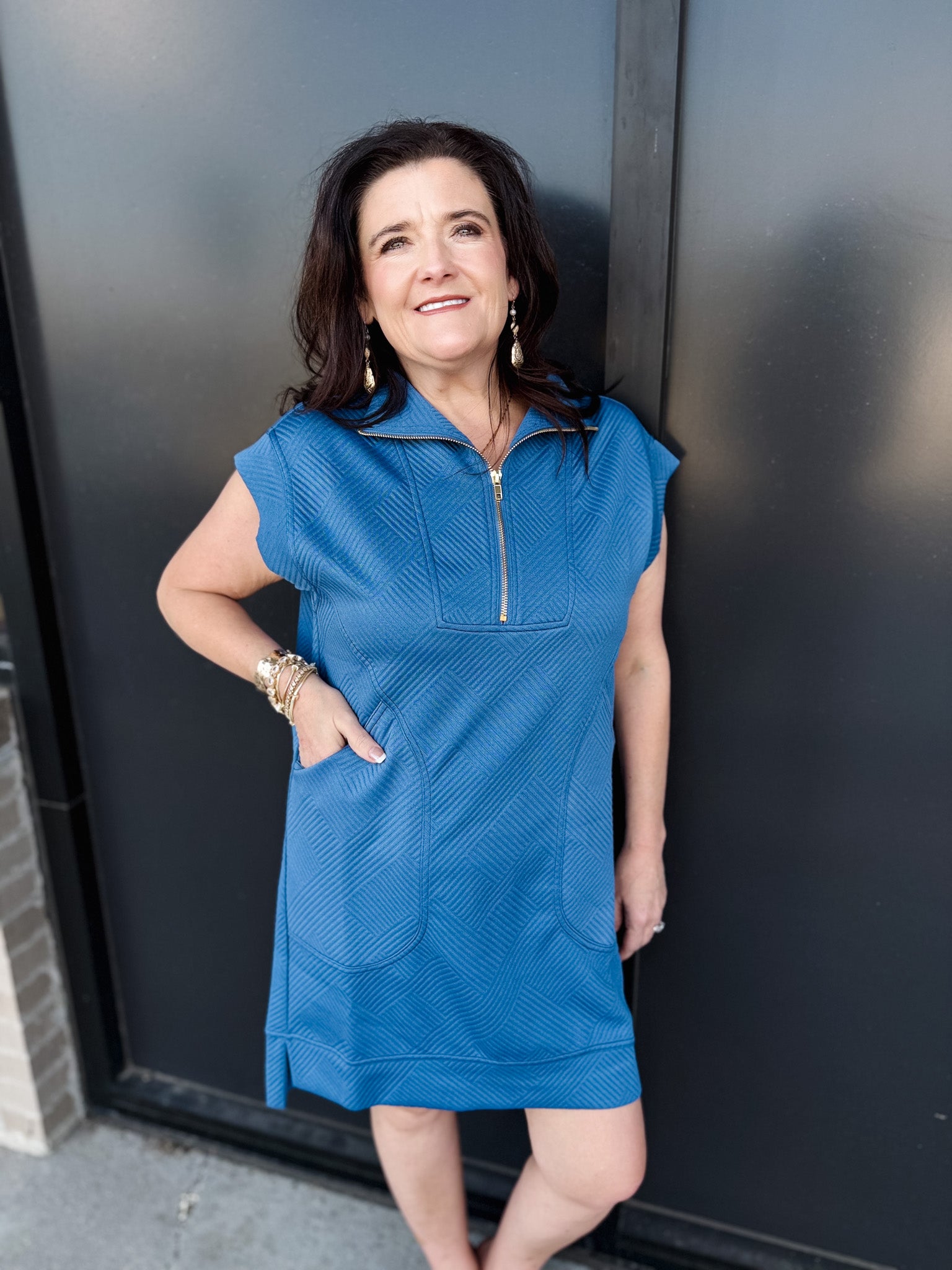 The Textured Knit Jacquard Quarter Zip Mini Dress is where effortless comfort meets everyday sophistication. With its soft jacquard knit and versatile quarter-zip neckline, this dress is an easy go-to for polished casual looks.