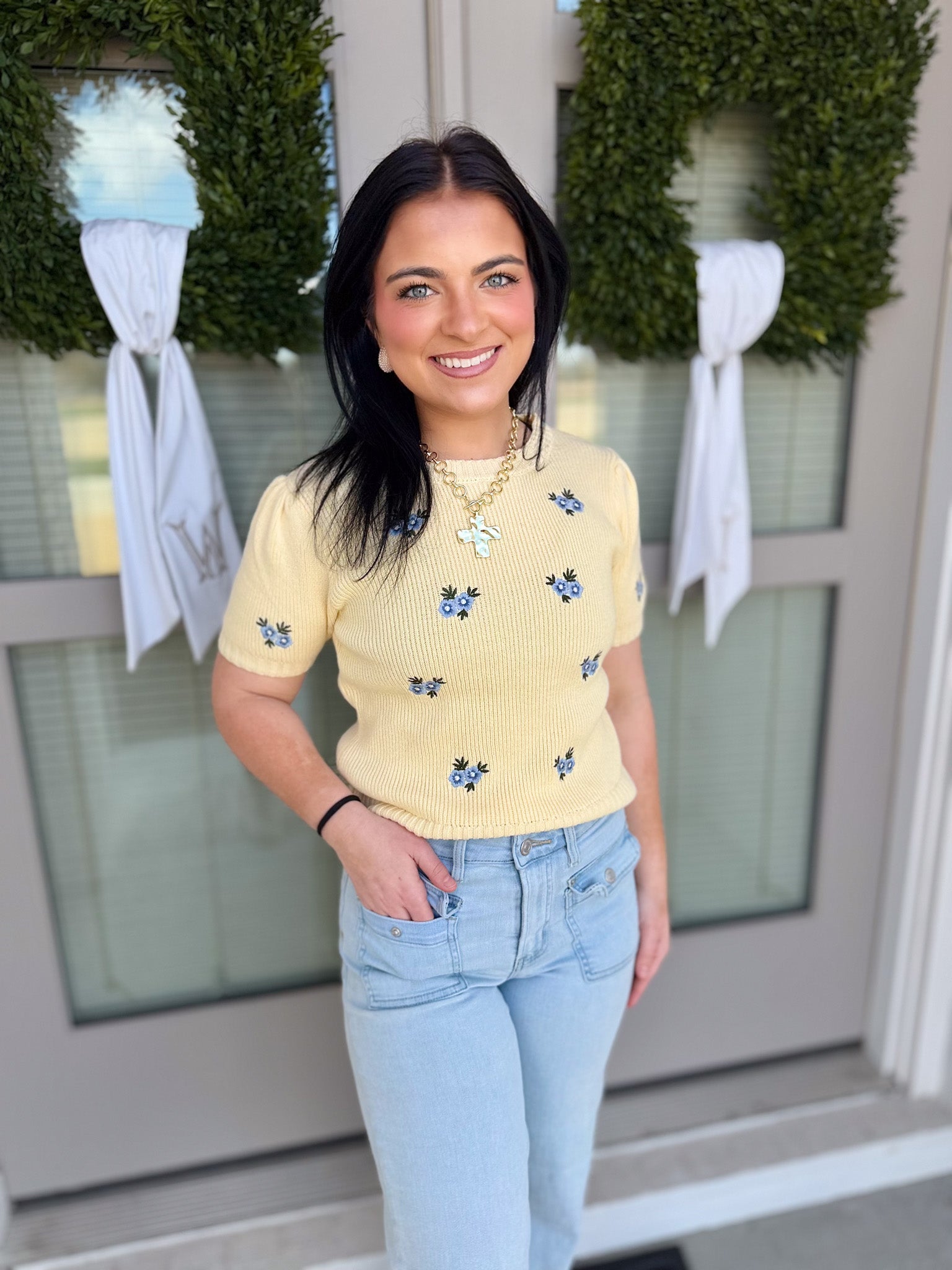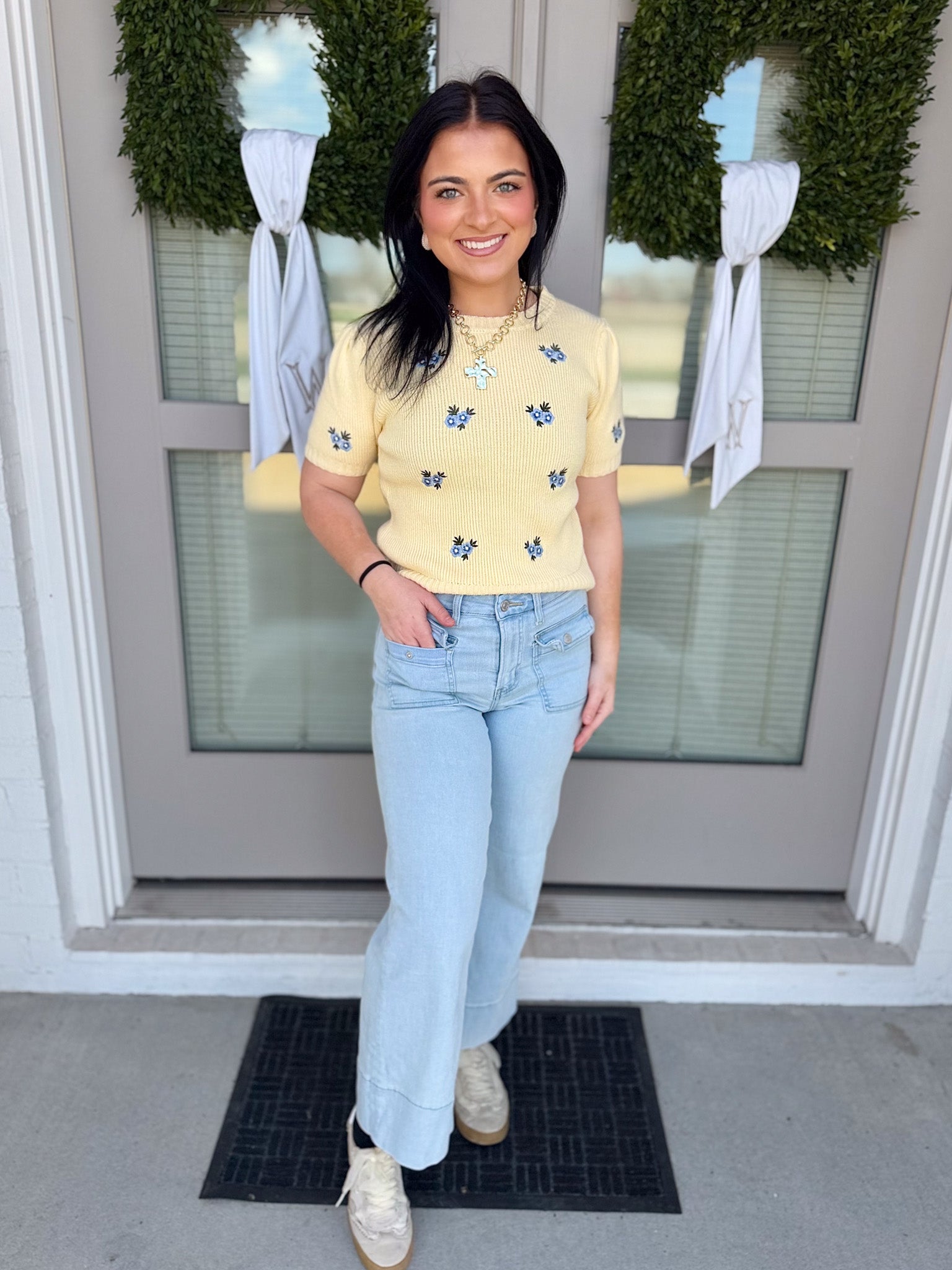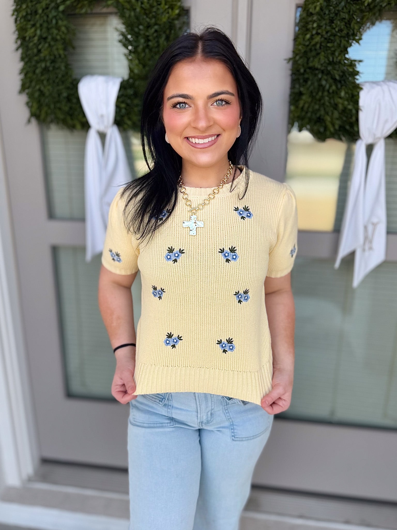 Floral Embroidery Round Neck Short Sleeve Sweater