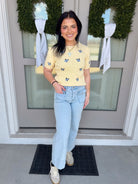 This charming short sleeve sweater features beautiful floral embroidery that adds a feminine touch to your everyday wardrobe. The classic round neckline and comfortable cotton-acrylic blend make it perfect for transitional seasons and layering.