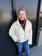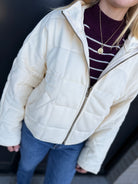 Stay cozy and chic in this thoughtfully crafted puffer jacket, made from a premium cotton-polyester blend for the perfect balance of softness, structure, and durability. The streamlined silhouette pairs easily with any outfit, while the front zipper closure allows for simple layering on cooler days.