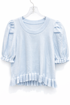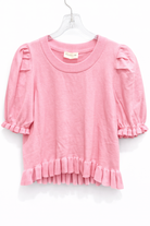 Pretty and precious scoop neck top featuring delicate ruffle trim along the armholes and bottom hem. Perfect elegance with a soft knit feel.