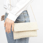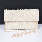 A luxurious evening clutch crafted entirely from faux pearls with mixed-metal accents and a chic chain strap. This sophisticated white clutch exudes timeless elegance and makes a stunning statement at parties, weddings, and special events.