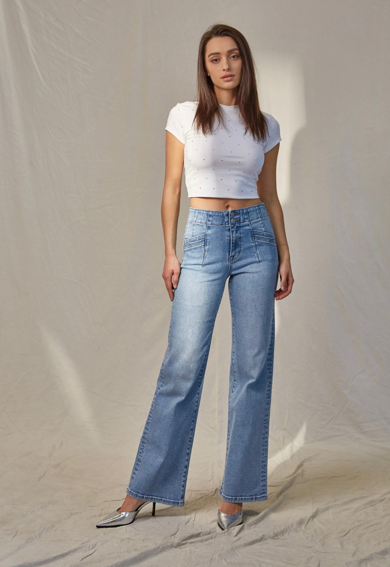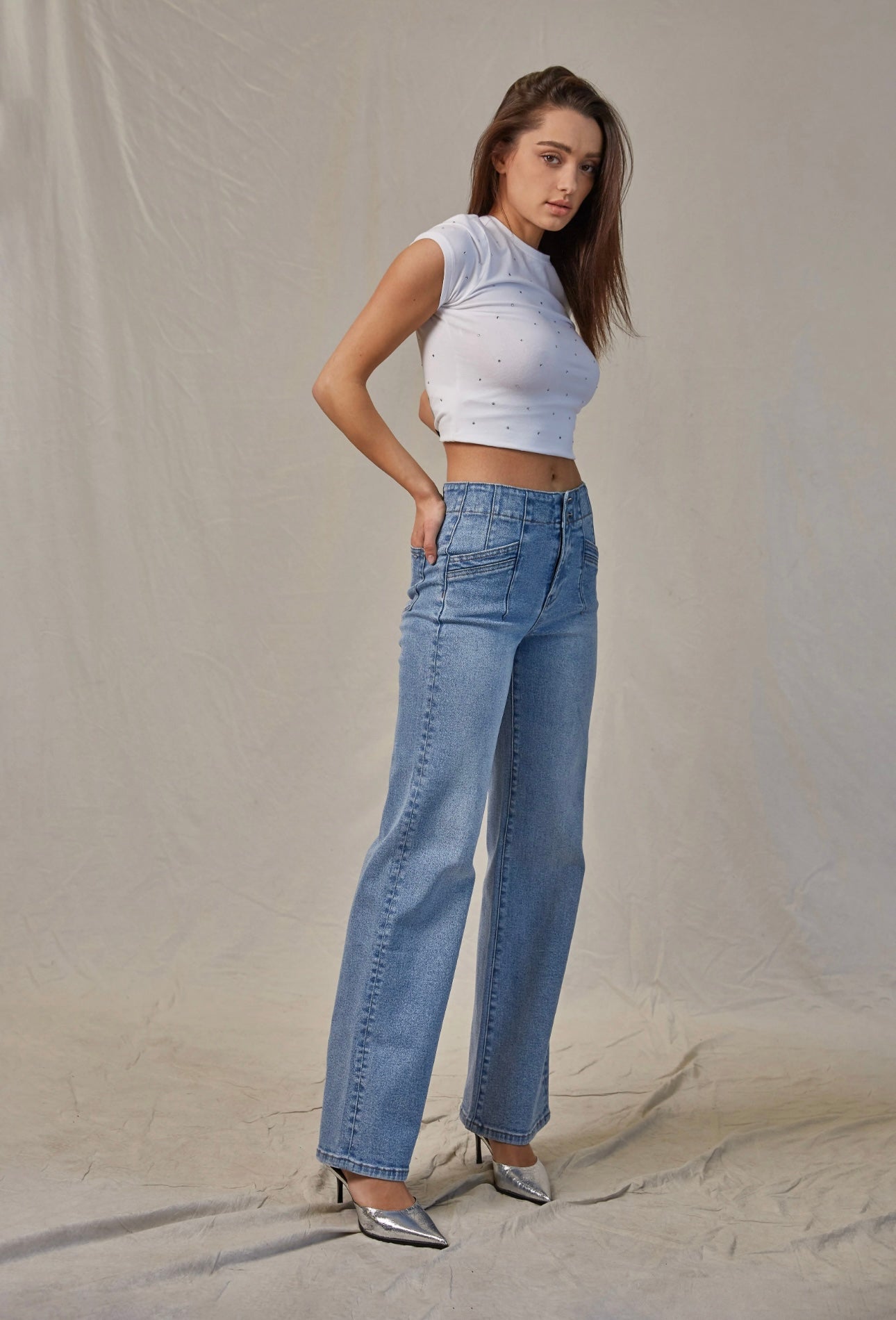 Elevate your wardrobe with our MD HR wide leg jeans featuring luxurious pin tuck detailing. Its high rise design creates a flattering silhouette while the wide leg adds a sophisticated touch. Perfect for making a statement in any occasion.