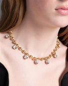 Elevate your jewelry collection with the stunning Emery Necklace from Yochi NYC — a true statement in modern elegance and luxury craftsmanship. Designed with 22K gold plating over brass, this piece features a strand of polished gold beads adorned with sparkling CZ charms throughout, creating a glamorous, eye-catching shimmer with every movement.