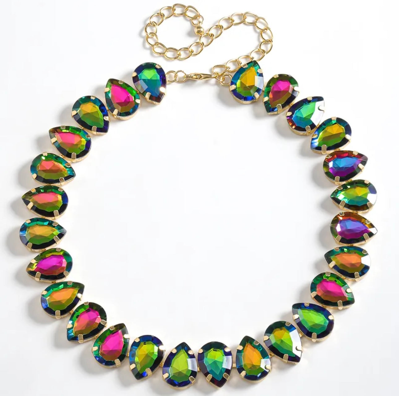 Dive into iridescent luxury with this show-stopping statement necklace featuring vibrant, multi-faceted teardrop crystals in a mesmerizing rainbow finish. Each stone captures and reflects light in brilliant flashes of pink, green, blue, and gold—evoking the magical shimmer of mermaid scales beneath the sea.