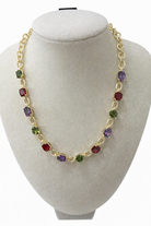 This sophisticated necklace showcases a curated palette of cubic zirconia stones in olive, burgundy, and deep purple—set in 14K gold plating. Designed to coordinate perfectly with the Vivienne Multi-Stone Bracelet, it features a secure lobster clasp and 2-inch extension for adjustable wear from 16 to 18 inches.