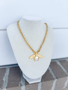 The WD Bee/Pearl Necklace is handcrafted to combine whimsical design with refined sophistication. Featuring a delicate bee motif accented with lustrous pearls on a polished chain, this necklace adds charm and elegance to any outfit. Lightweight and versatile, it’s perfect for layering or wearing alone as a statement piece.