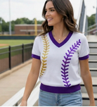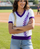 A Bead Bloom Boutique exclusive — this lightweight baseball sweater top is embellished in LSU Tigers-inspired purple and gold sequins. Equal parts game-day glam and effortless style, it's the piece your tailgate wardrobe has been waiting for.