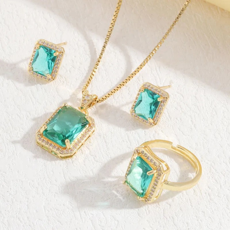 - Complete three-piece set: necklace, earrings, and ring