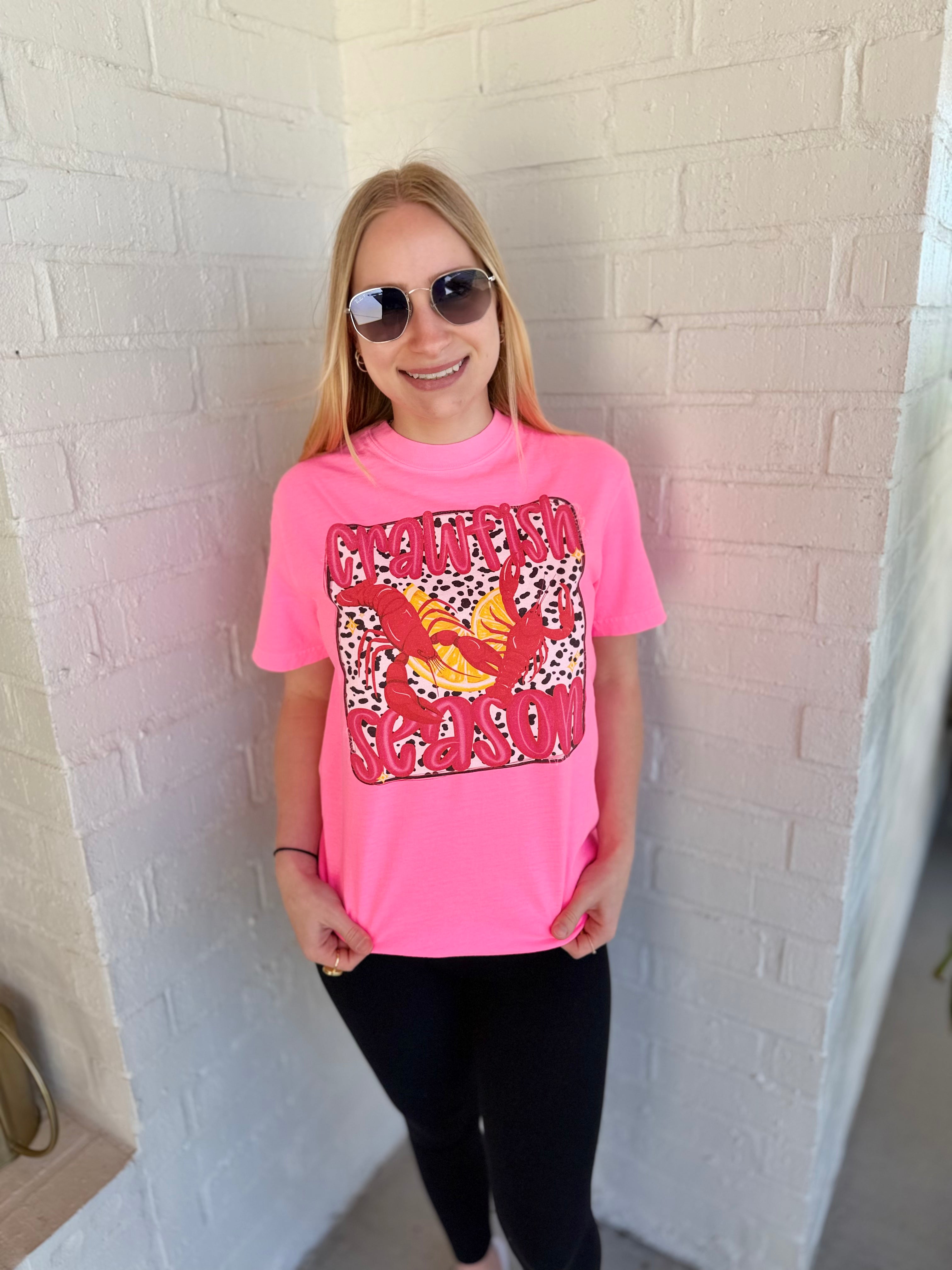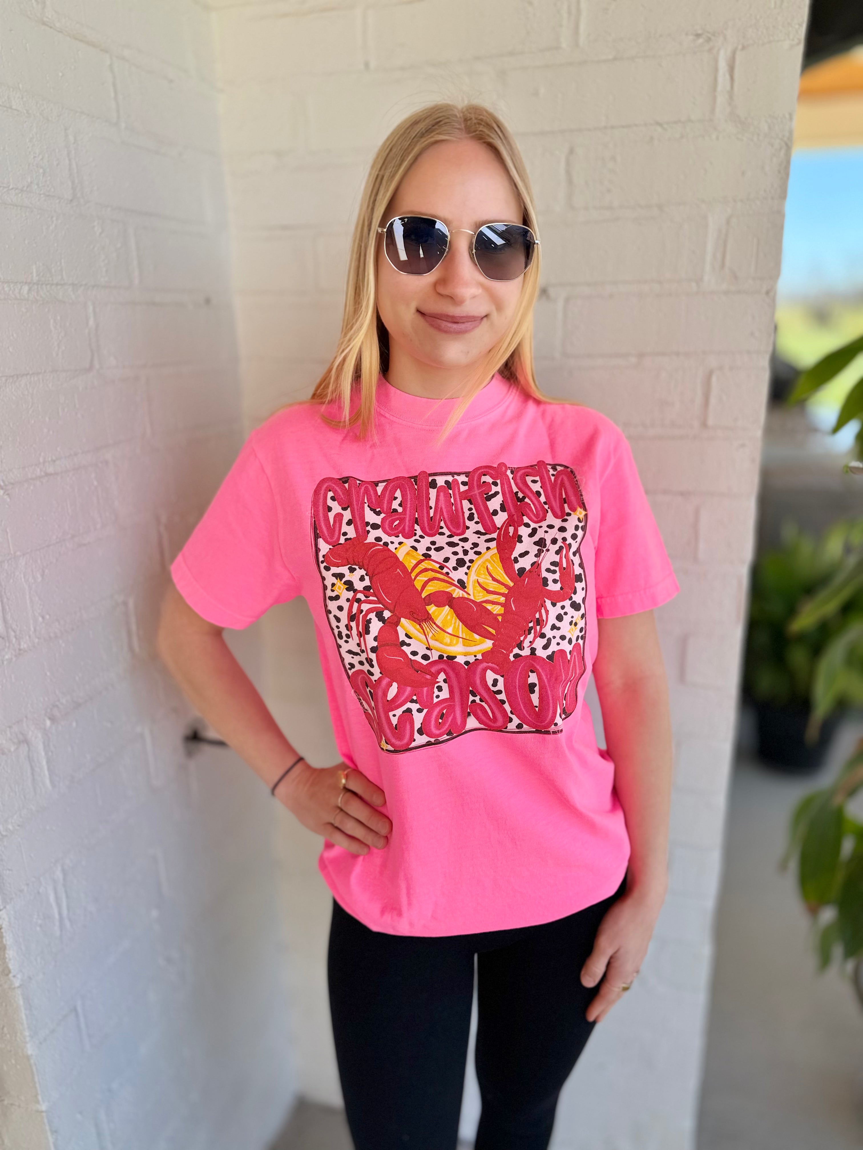 Celebrate Louisiana's favorite time of year in bold, eye-catching style with our Crawfish Season t-shirt in vibrant neon pink.
