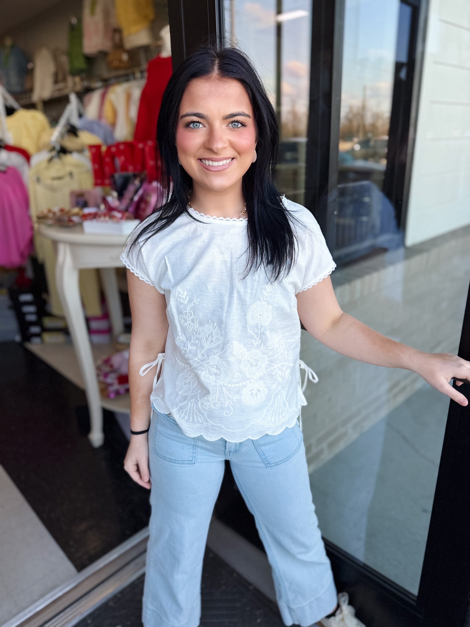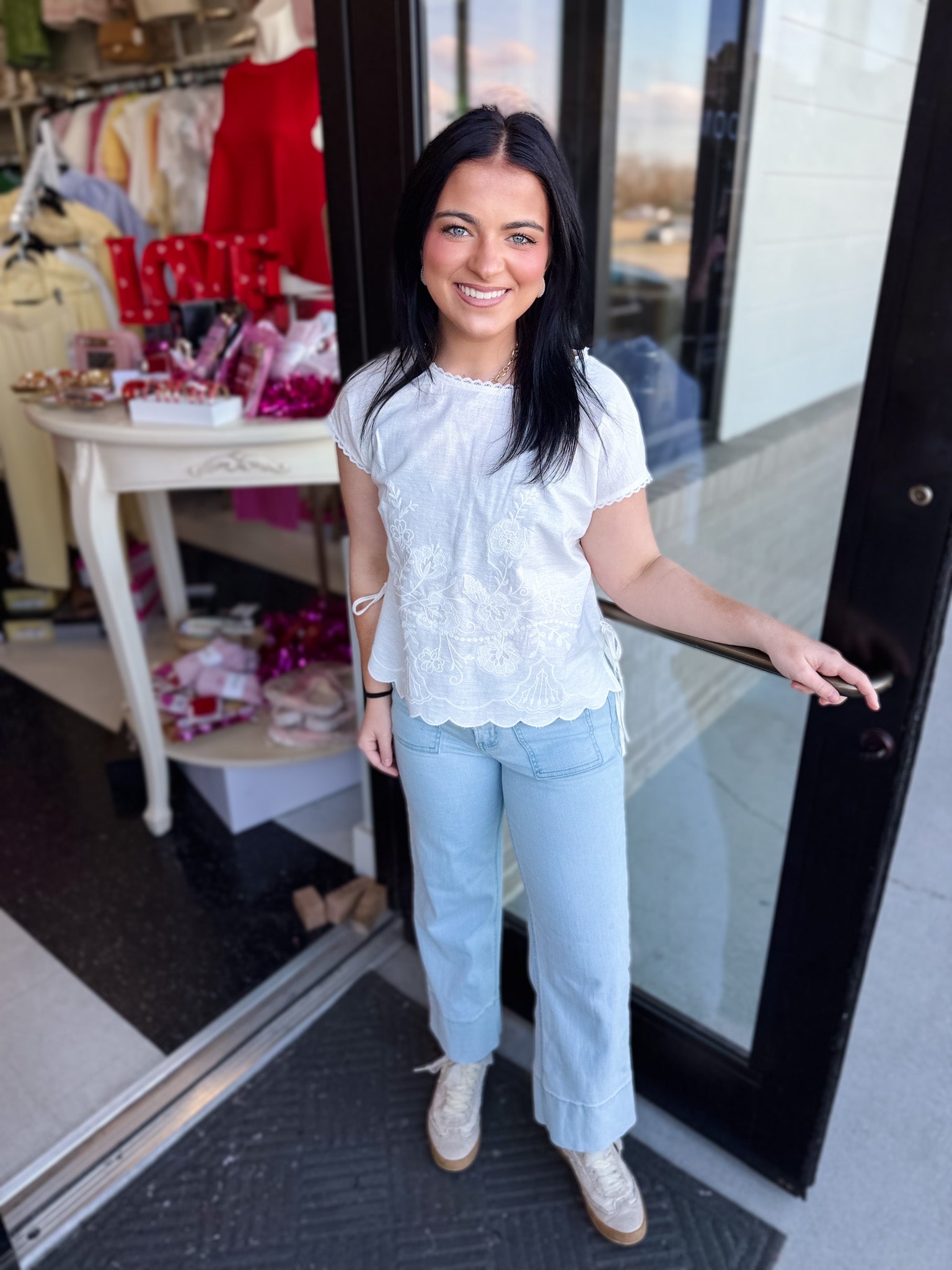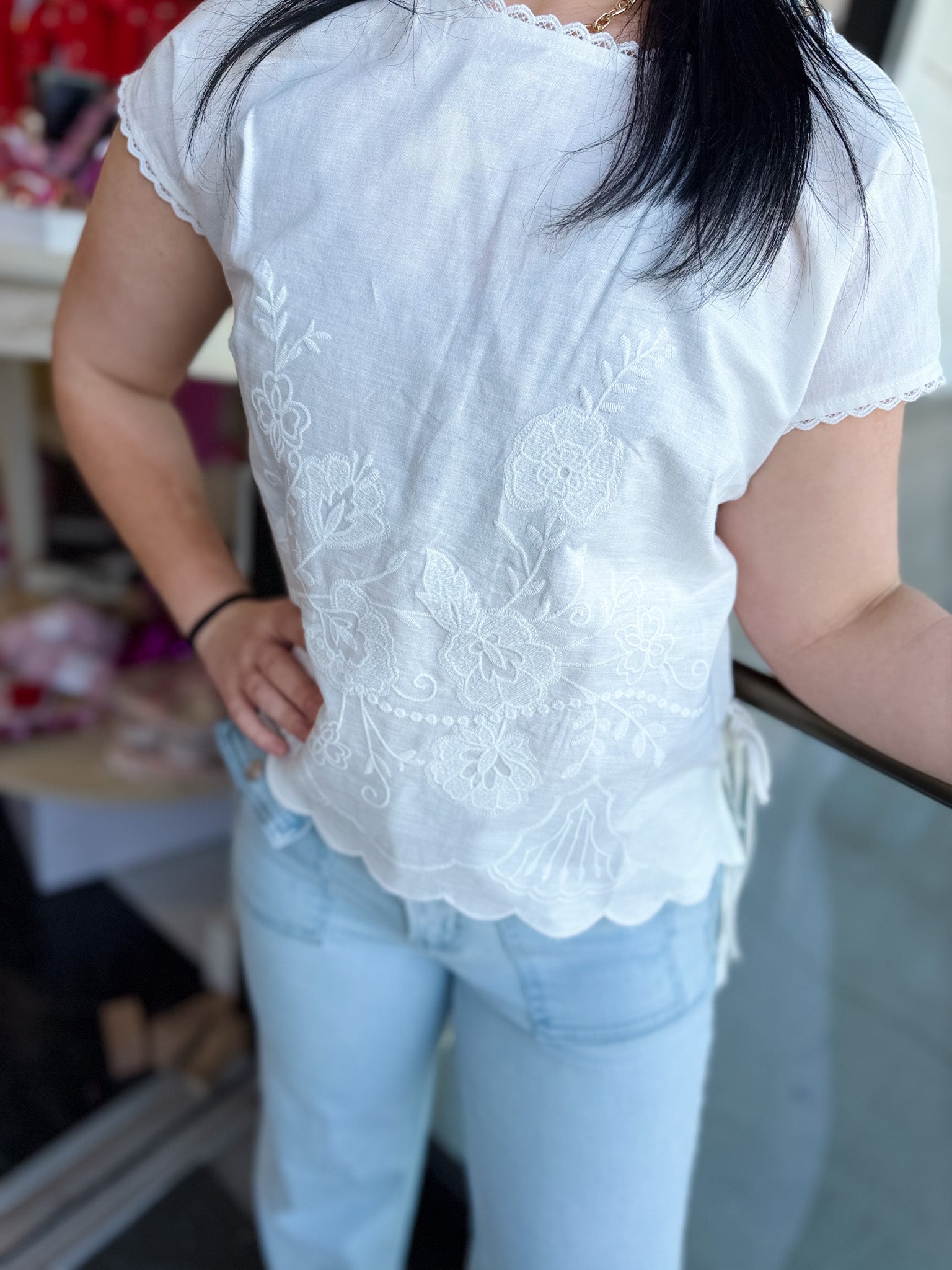 Light, airy, and effortlessly feminine — this linen blend top is made for warm days and easy styling. Designed with delicate lace trim along the collar and soft cap sleeves, it brings a romantic touch to a classic silhouette. The adjustable tie details on each side add subtle shape, while the scalloped hem finished with white embroidery creates a beautifully detailed finish.