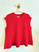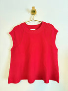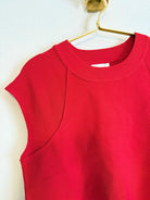 This vibrant red knit top brings a pop of color to your wardrobe with its sleek sleeveless design. The band detail around the neck creates a polished finish, while the flowy silhouette near the bottom offers comfortable movement and a flattering drape.