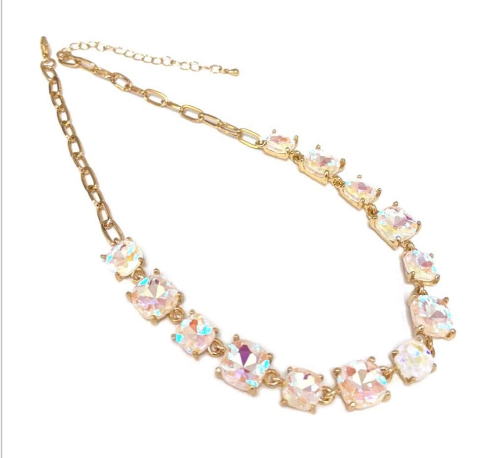 This necklace is a stunning centerpiece that works beautifully on its own or as part of a coordinated set. Pair it with the Stardust Drop Earrings for a polished, celestial look, or add the Stardust Adjustable Ring to create a complete jewelry ensemble that's perfect for any occasion. The alternating stone sizes and opalescent shimmer add a unique, magical touch that sets this piece apart.