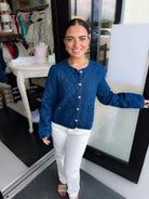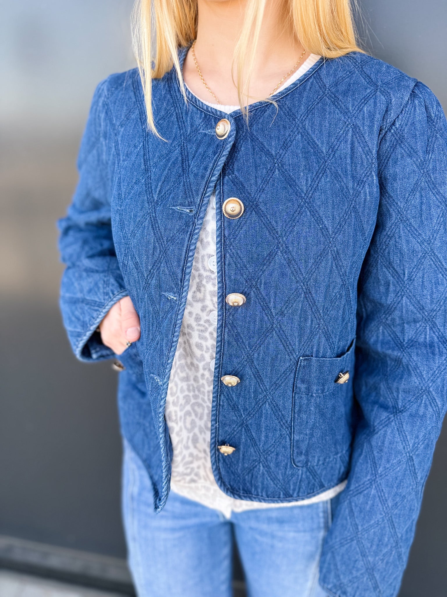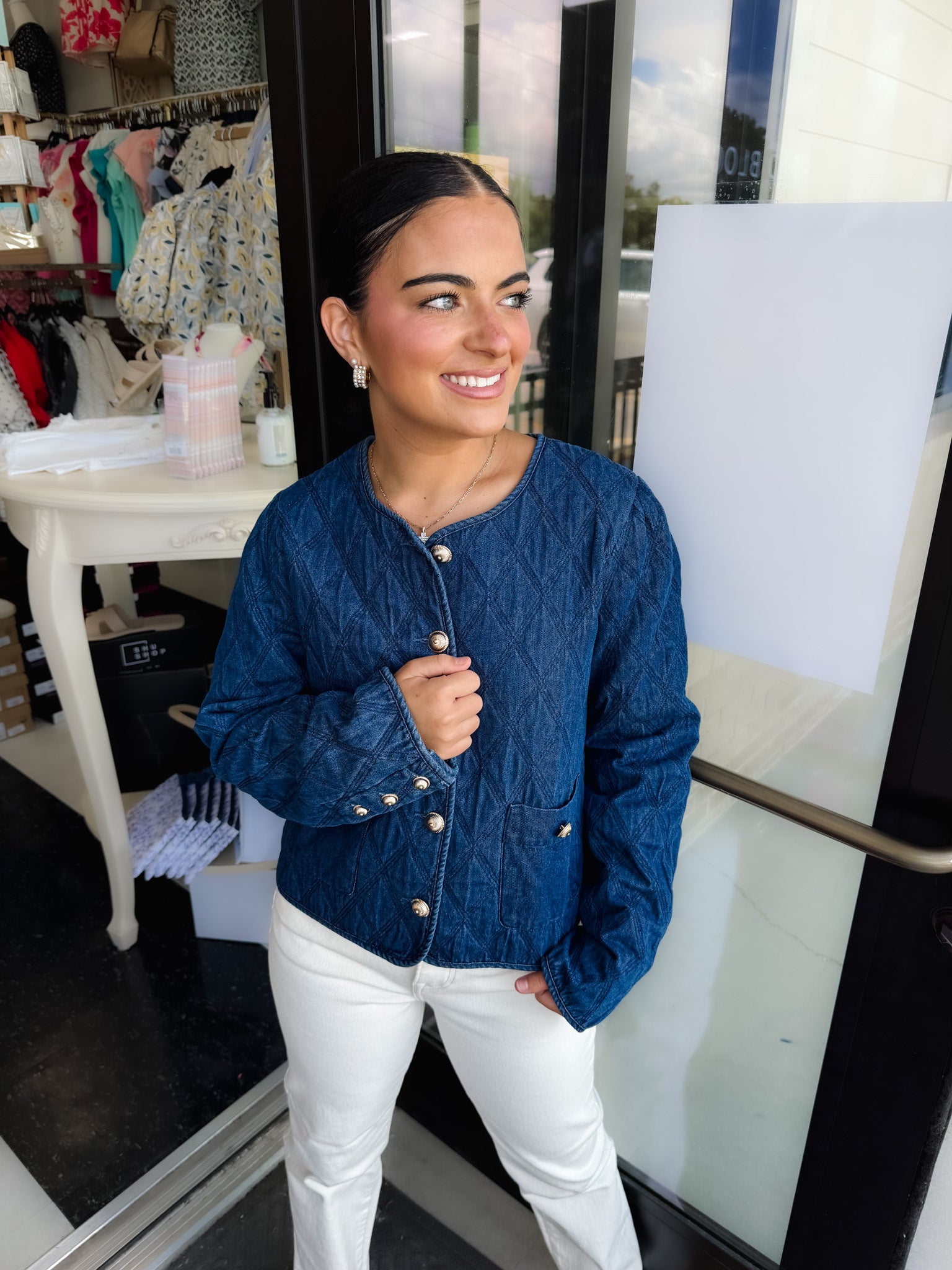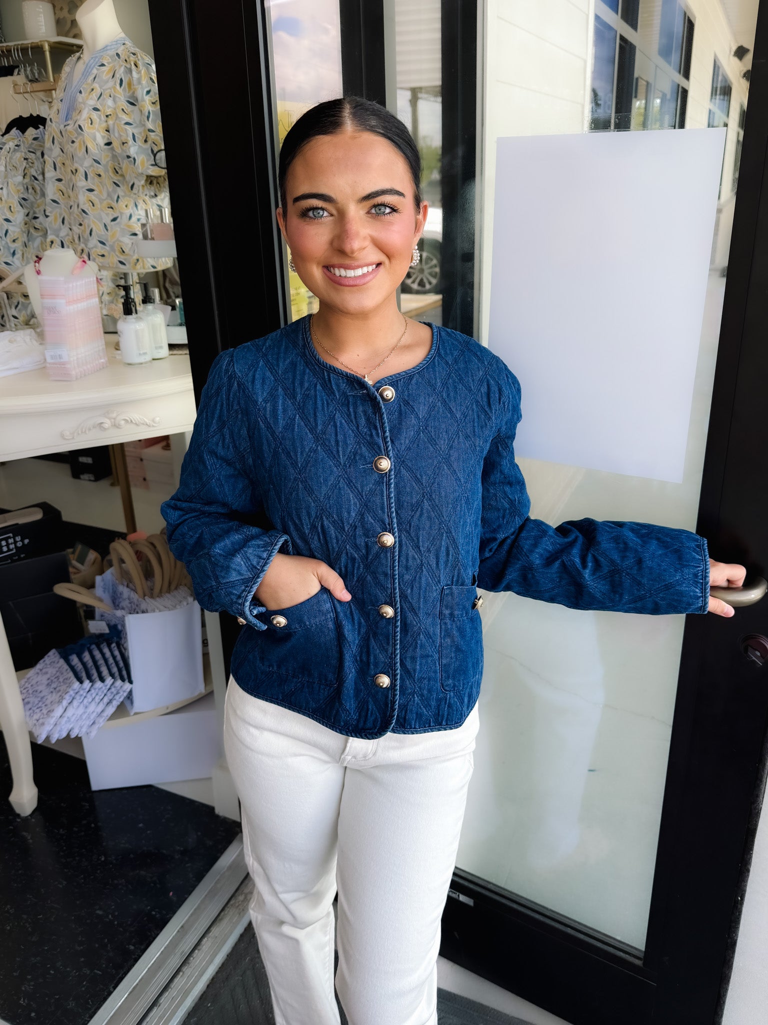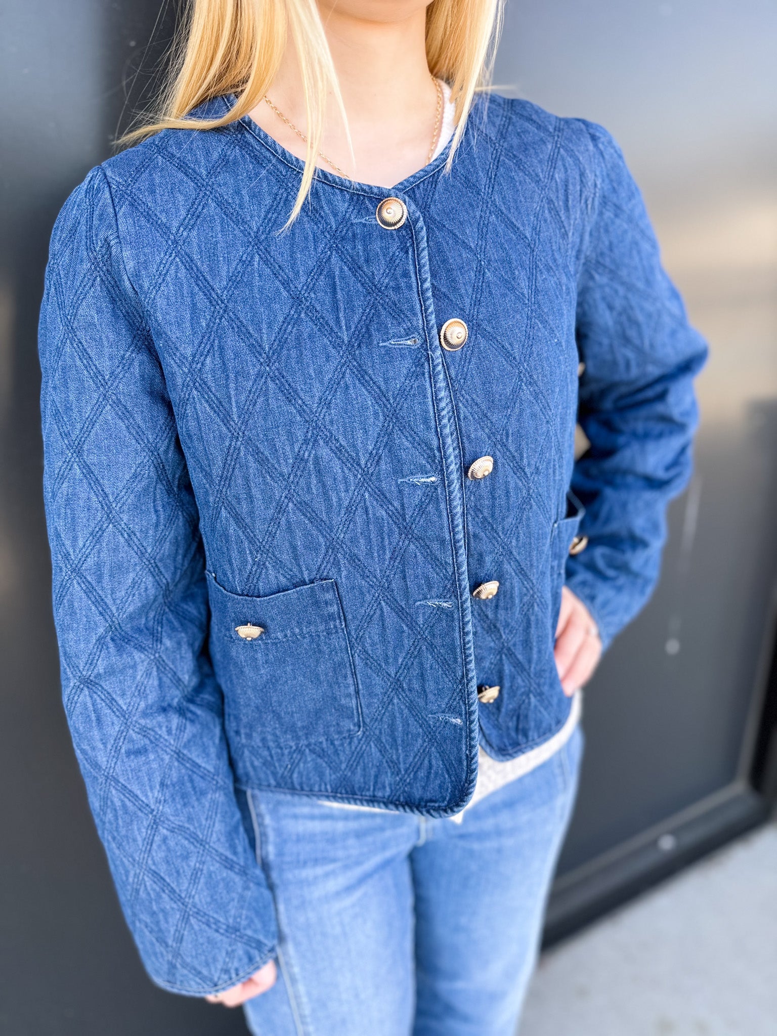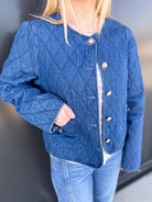 Elevate your wardrobe with the Entro Shoot Your Shot Jacket, a refined denim quilted piece featuring elegant gold buttons. This jacket combines classic texture with a touch of luxury, offering both warmth and timeless style for a polished, sophisticated look.