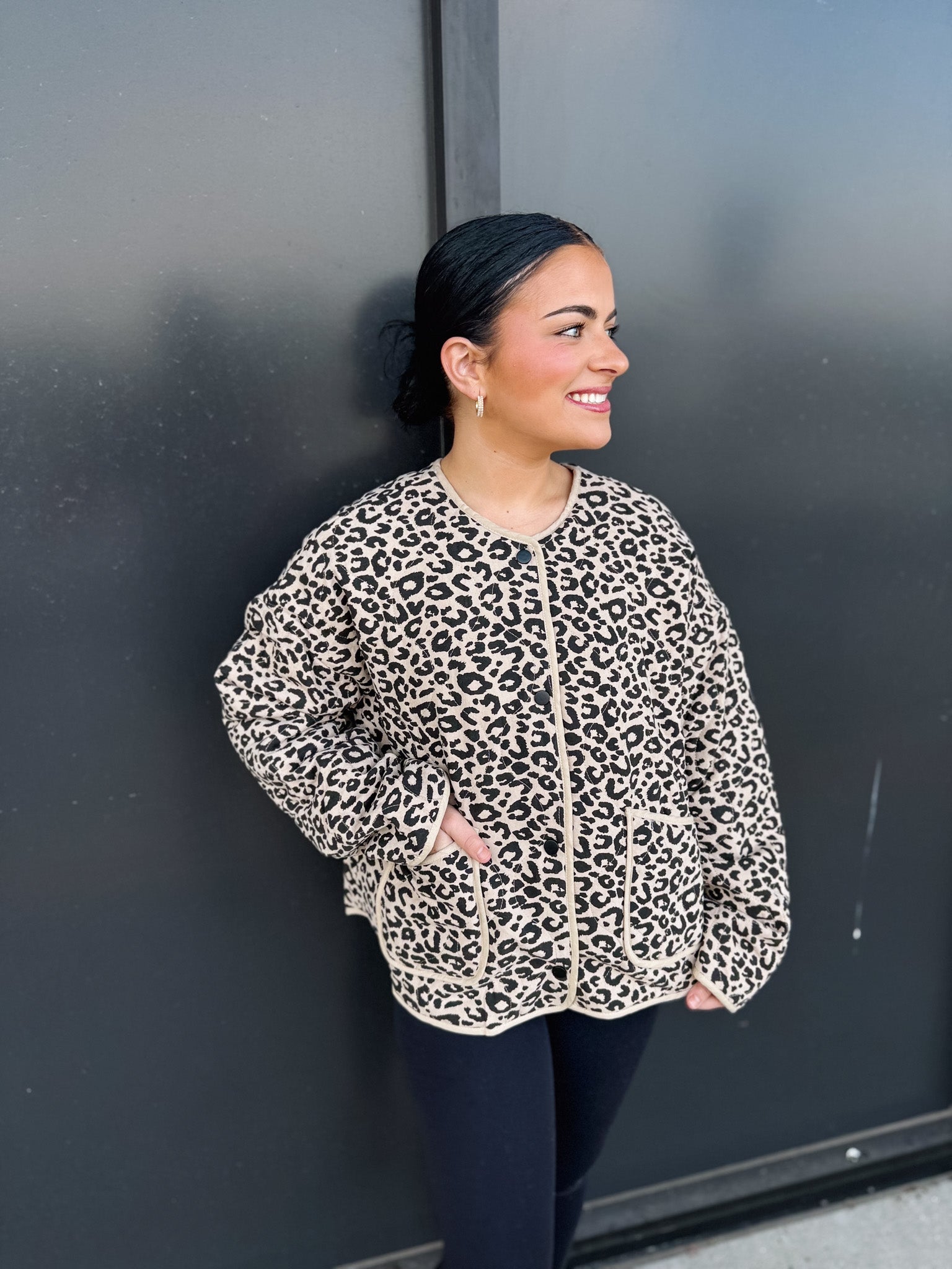 Styling options are endless with the Leopard Quilted Jacket. For casual outings, pair it with jeans, a simple tee, and sneakers for an effortlessly cool, everyday look. Heading to lunch with friends? Throw it over a knit dress and boots for instant chic appeal. It’s also the perfect jacket to grab for travel, as it strikes the balance between comfort, warmth, and bold style without taking up too much space.