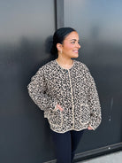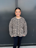 What truly sets this jacket apart is its leopard print pattern—a bold yet timeless motif that instantly elevates any outfit. Leopard is a fashion classic that never goes out of style, and here it’s reimagined in a modern, wearable way. Whether you’re dressing casually for a day of errands or adding a little flair to an evening look, this jacket ensures you’ll stand out in the best way possible.