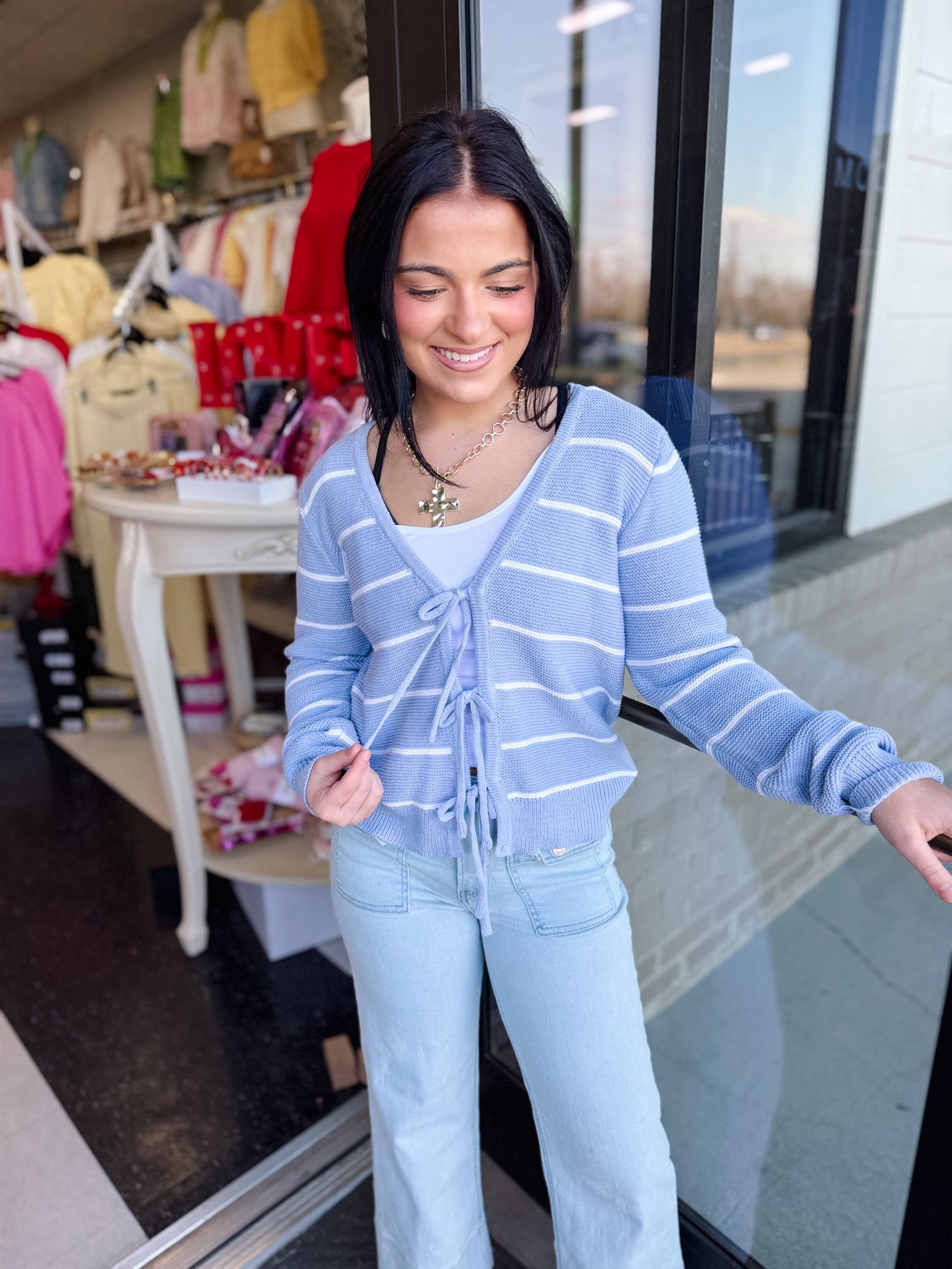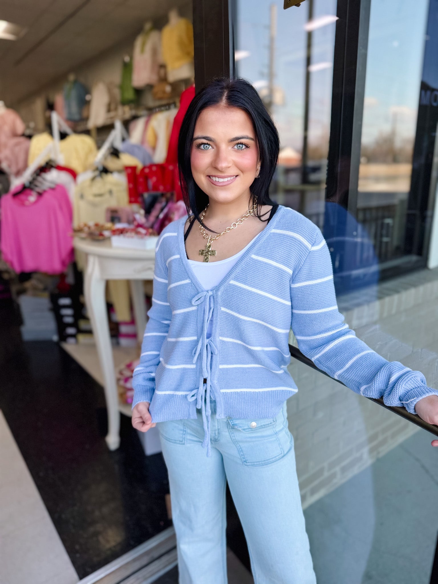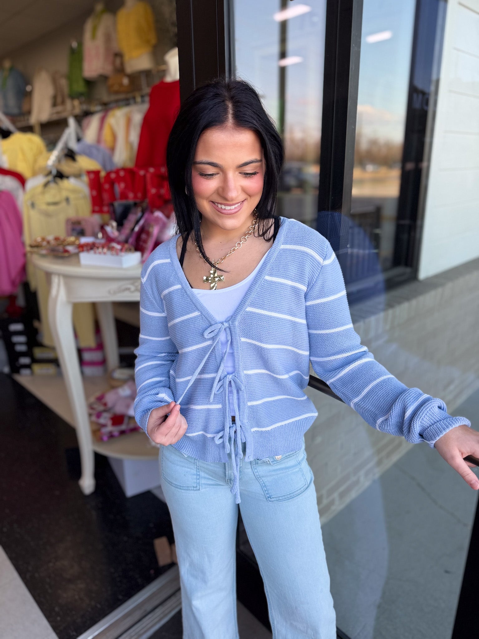 V Neck Bow Tie Front Long Sleeve Striped Sweater Cardigan