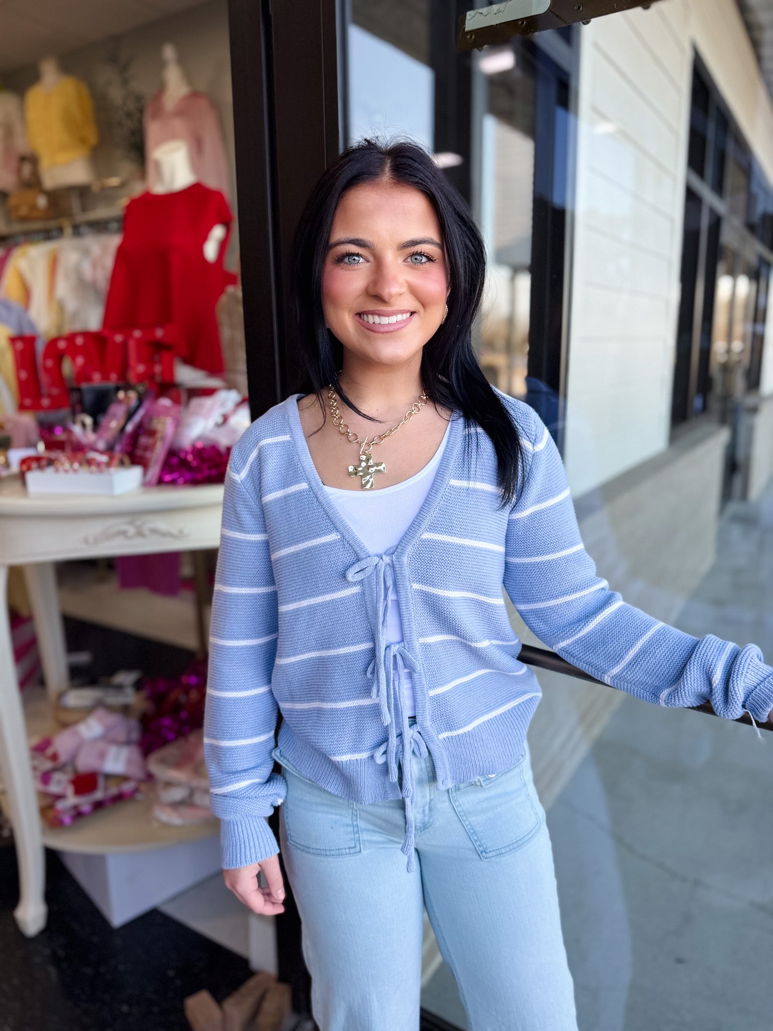Elevate your layering game with this sophisticated striped sweater cardigan. The flattering V-neck and charming bow tie front detail create a feminine silhouette that transitions seamlessly from office to evening.