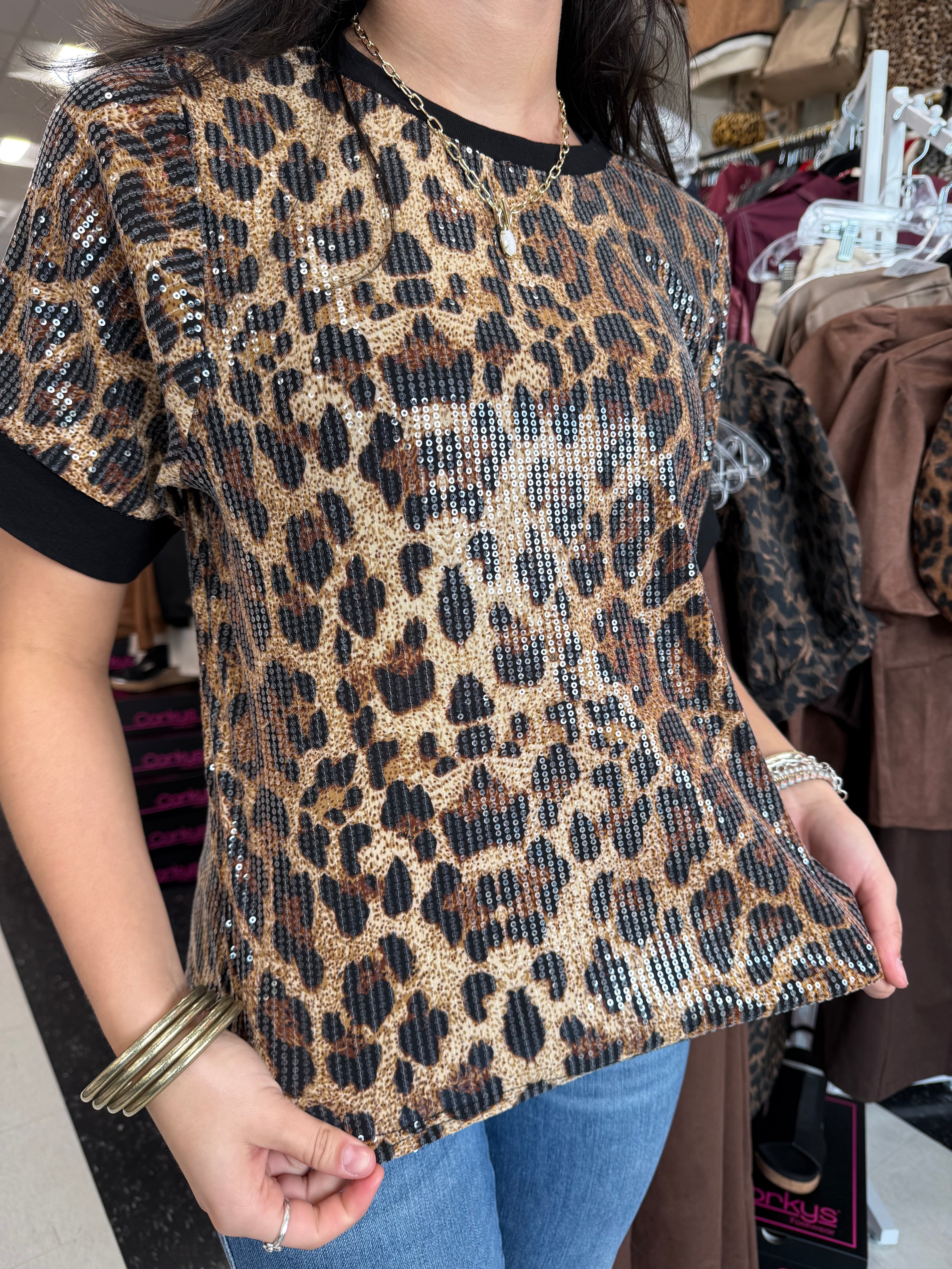 Turn heads with this brown leopard sequin top, a perfect blend of daring pattern and sophisticated design. The short sleeves and contrast ribbed crew neckline and cuffs create a polished, structured silhouette, while the shimmering sequins add a subtle sparkle that elevates any outfit. Ideal for evening outings, holiday events, or chic daytime looks, this top brings effortless glamour to your wardrobe.