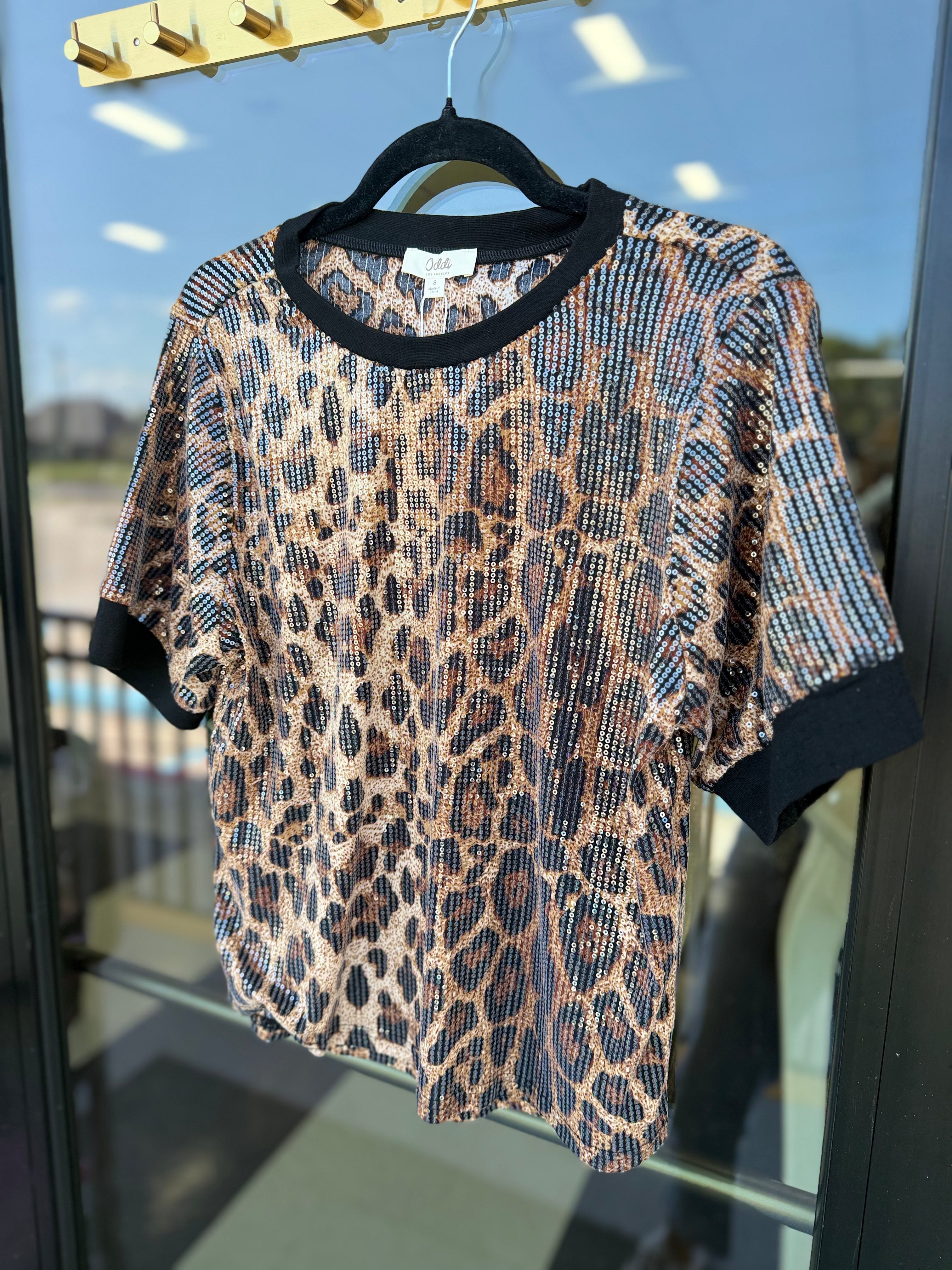 Style Tip: Pair with sleek black trousers or a high-waisted skirt for a polished evening look, or layer under a tailored blazer to add sparkle to a professional ensemble. Accessorize with gold jewelry to enhance the warm tones of the leopard print.