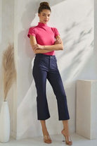 Straight leg | Cropped cut | Pull-on waistband | Faux zipper fly | Belt loops | Pockets