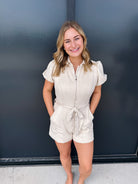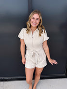 Elevate your wardrobe with the Suede Chicago Romper in cream, featuring a sleek front zipper for easy wear and a refined bow tie belt that cinches the waist elegantly. Crafted with soft suede texture, this romper combines sophistication and comfort, making it a perfect choice for stylish, confident dressing.
