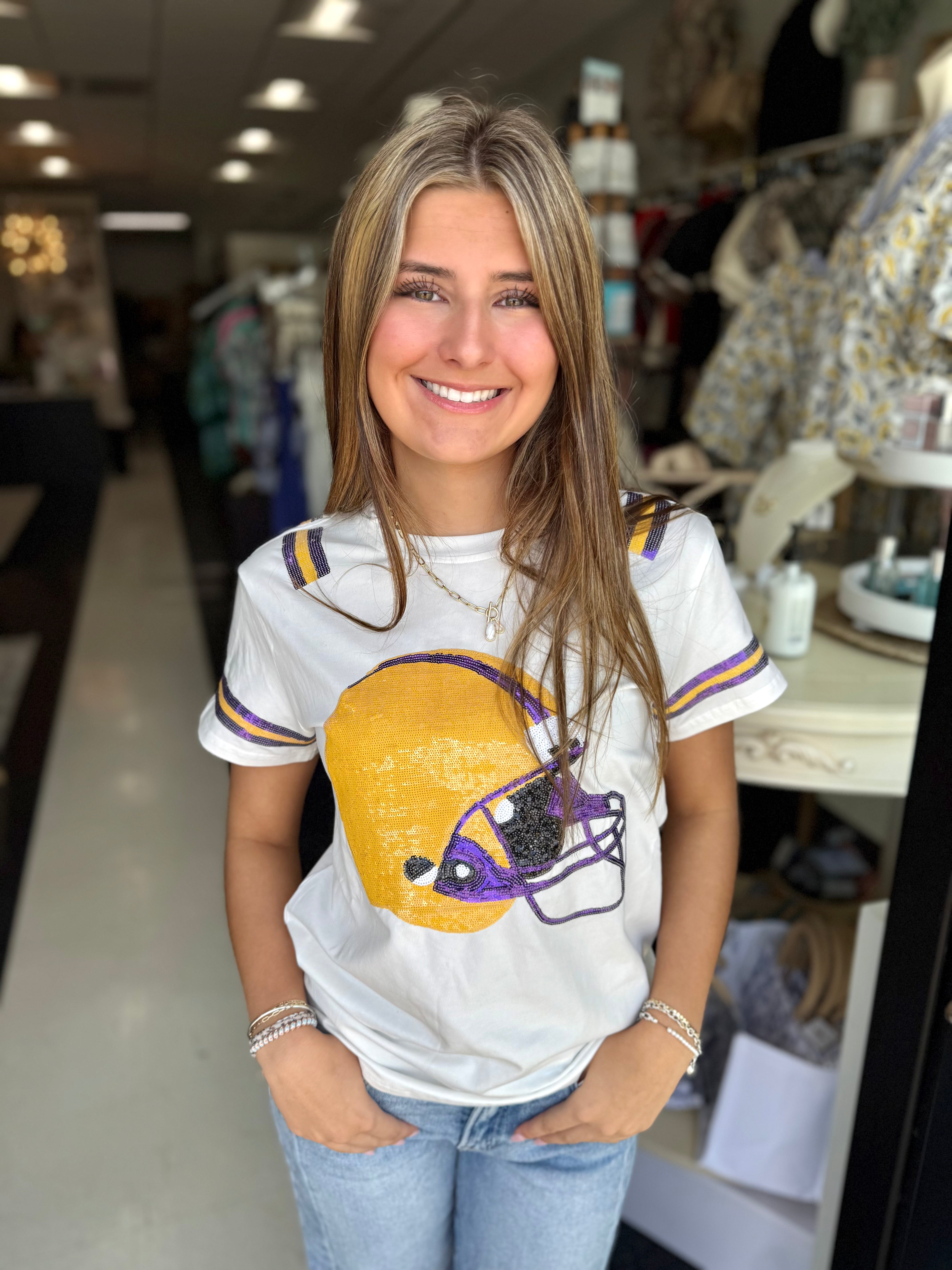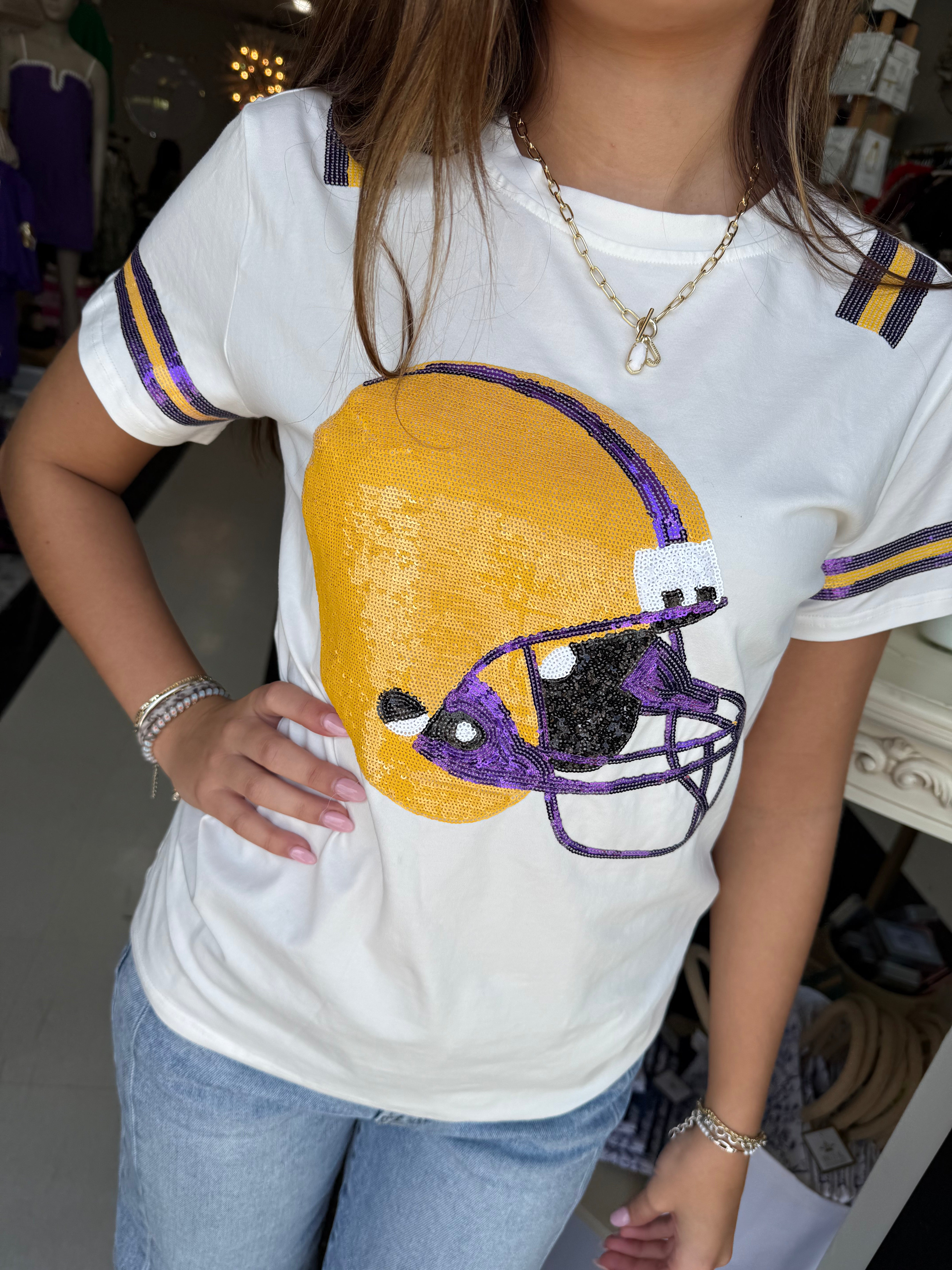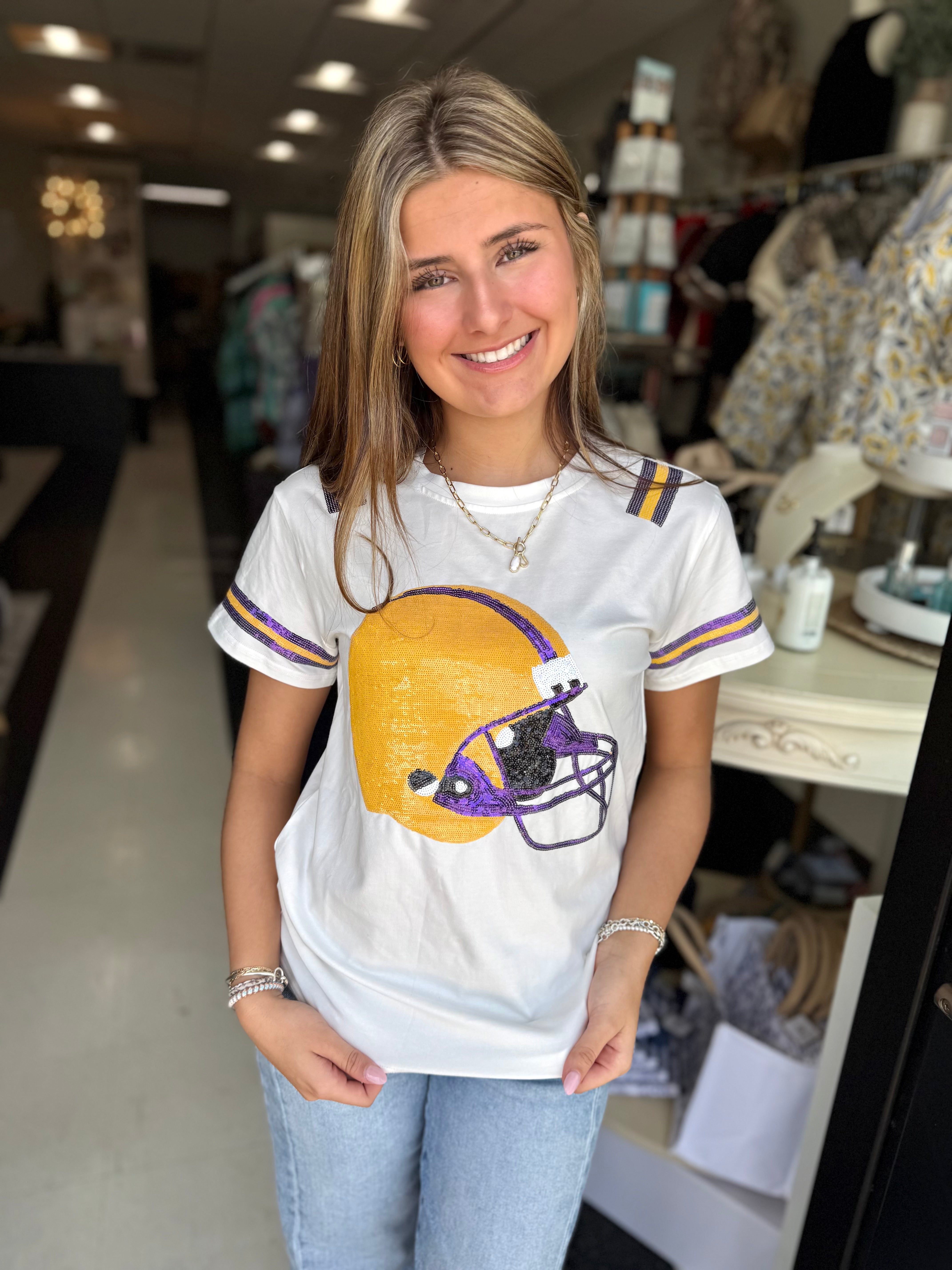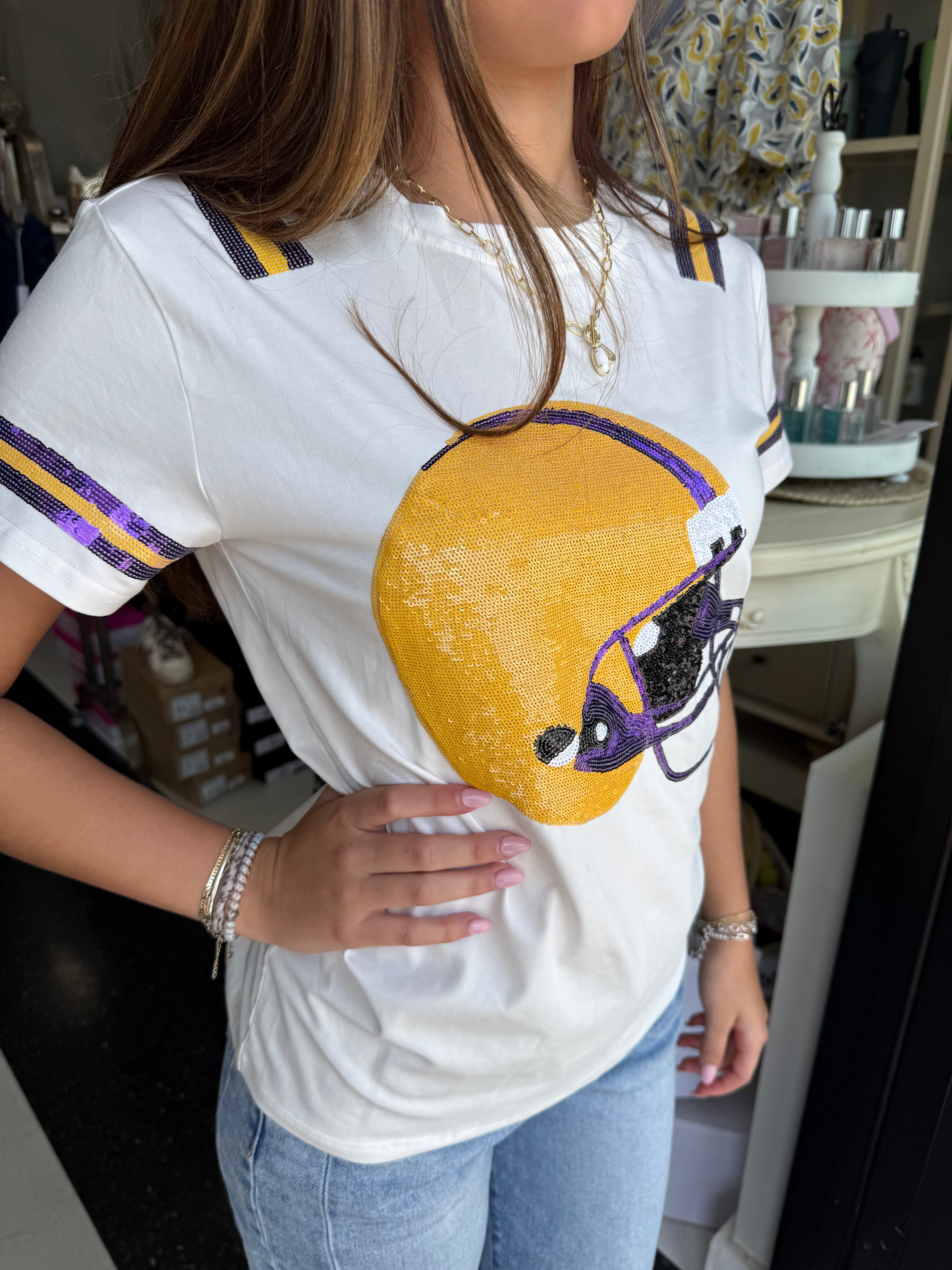 Elevate your casual wardrobe with the BC Helmet Tee, featuring a refined white fabric adorned with a striking purple and yellow sequin alpaca helmet design. This sophisticated tee blends playful artistry with understated elegance, making it a versatile choice for those who appreciate unique, stylish details in everyday wear.