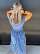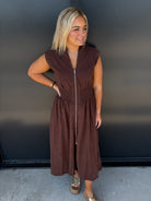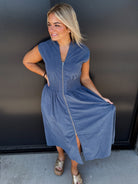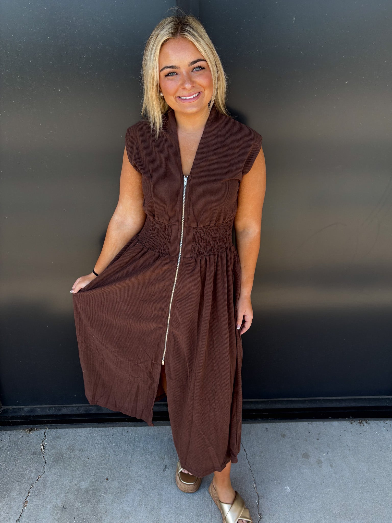 This corduroy midi dress features a drop shoulder design and a smocked waist for a flattering silhouette. The front zip adds effortless style and ease, while practical pockets bring convenience to your look. Crafted from soft corduroy fabric, it offers both comfort and a refined texture, perfect for elevating your everyday wardrobe with understated sophistication.