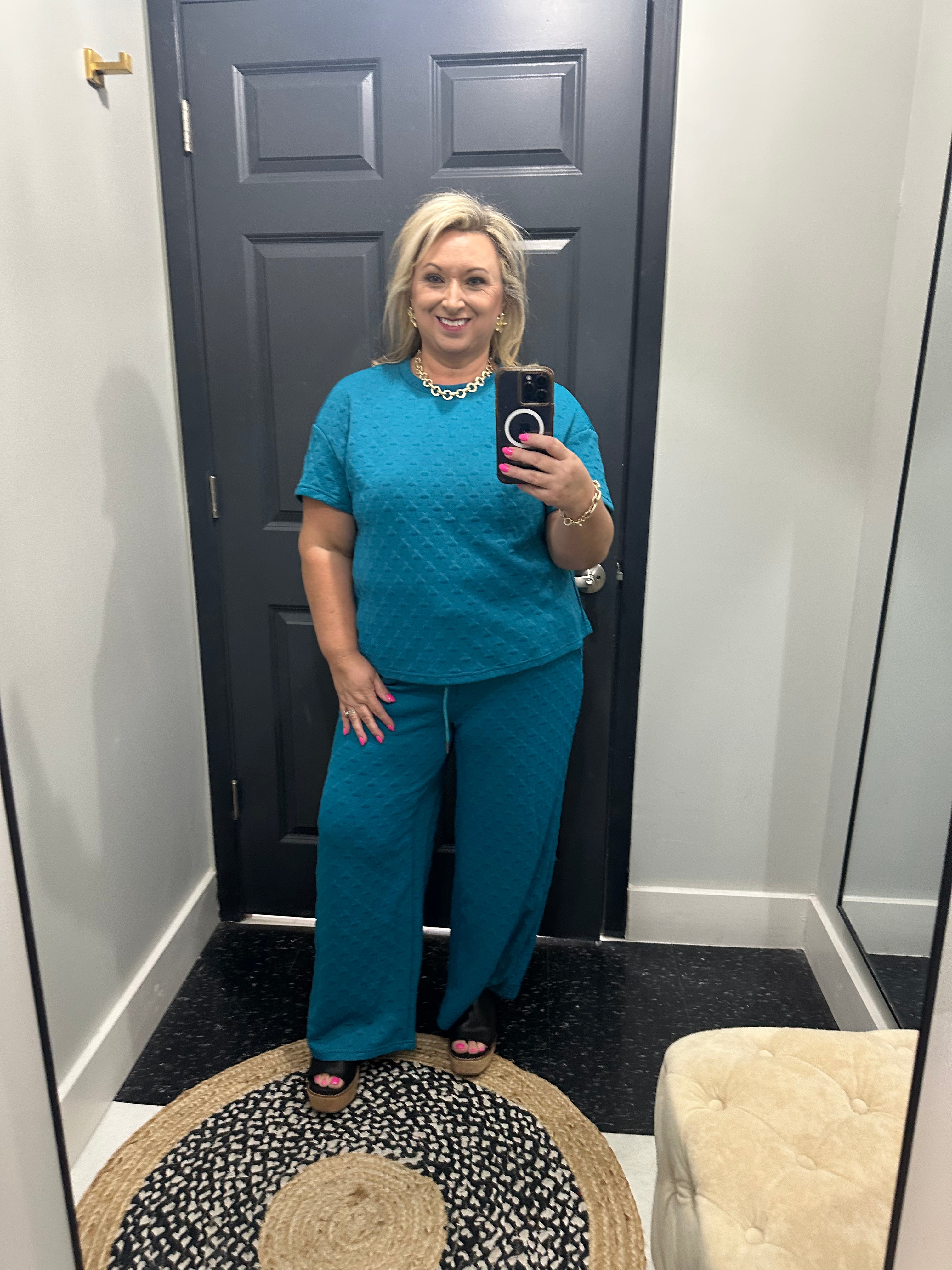 Step into effortless style with the DT Ramona Set, featuring a textured round neck short sleeve top paired with matching pants. This playful duo offers comfort and charm, perfect for days when you want to feel relaxed yet put-together. Whether lounging or out and about, the soft texture and easy fit make it your new go-to outfit.
