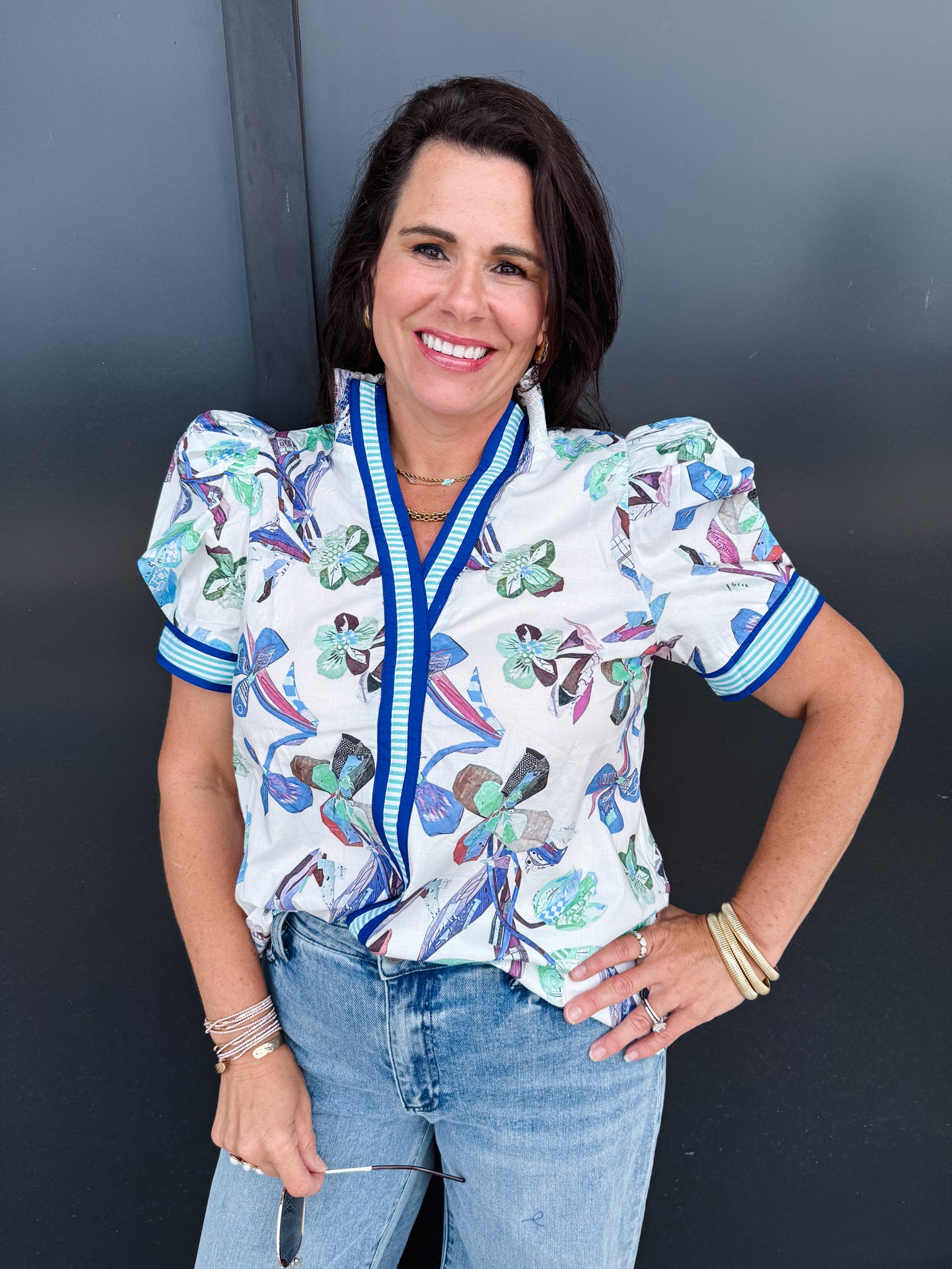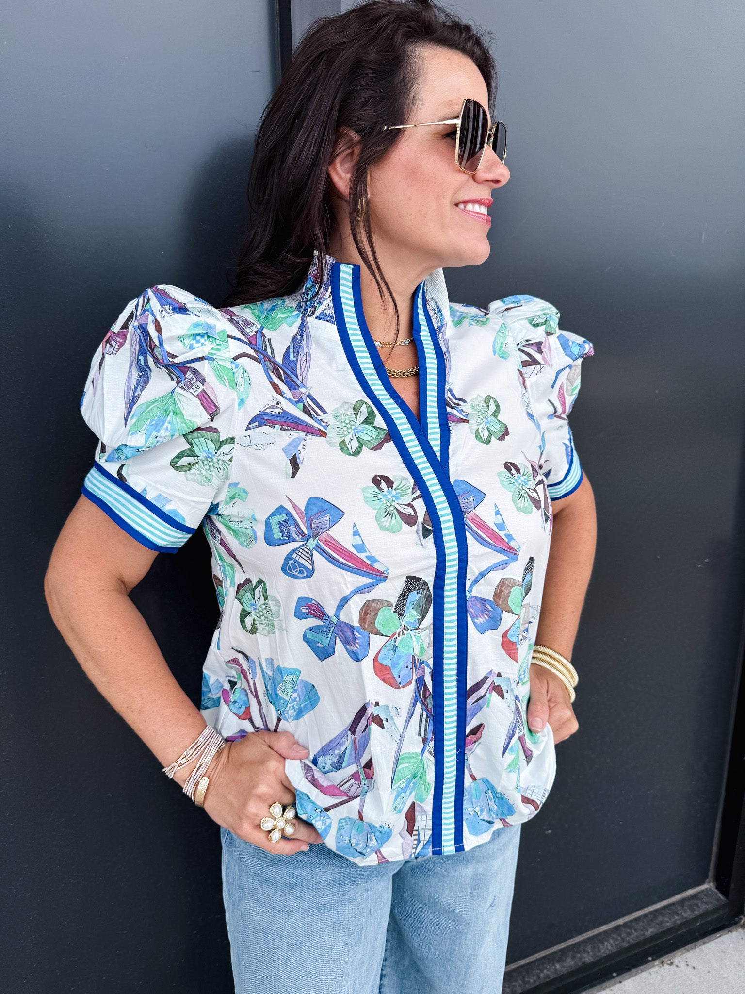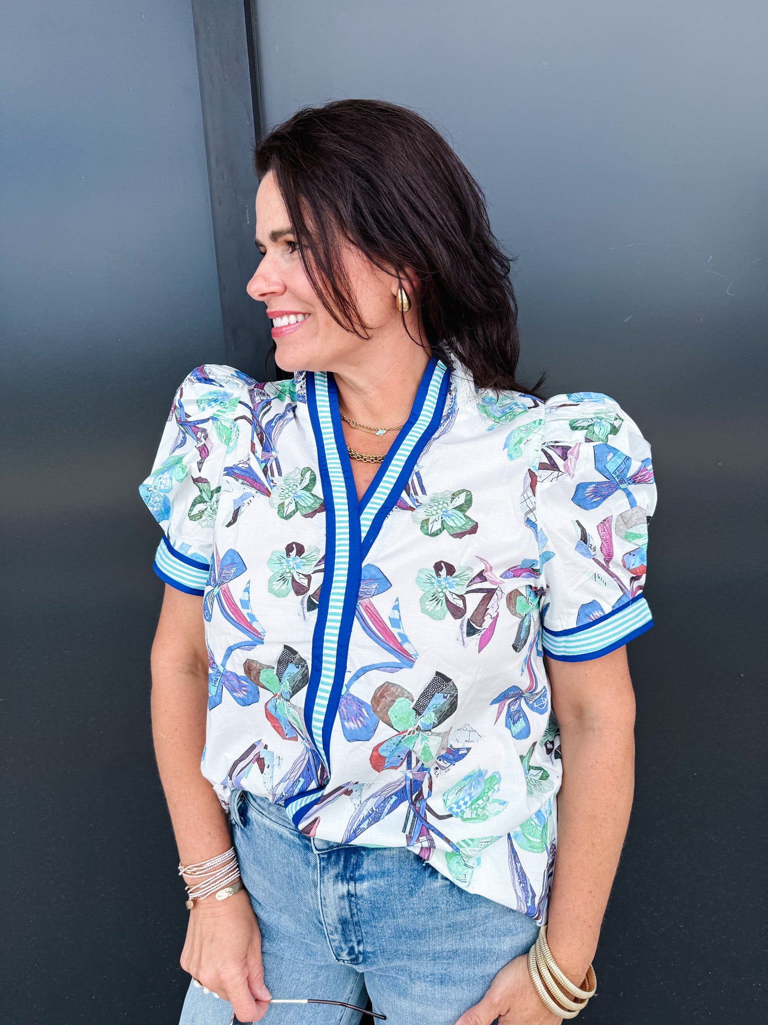 Elevate your style with the Entro Prim Top featuring a whimsical stripped collar that frames your face beautifully. The abstract floral pattern dances across the fabric, adding a touch of artistic flair to your everyday wardrobe. Perfect for those who love to express their personality through fashion!