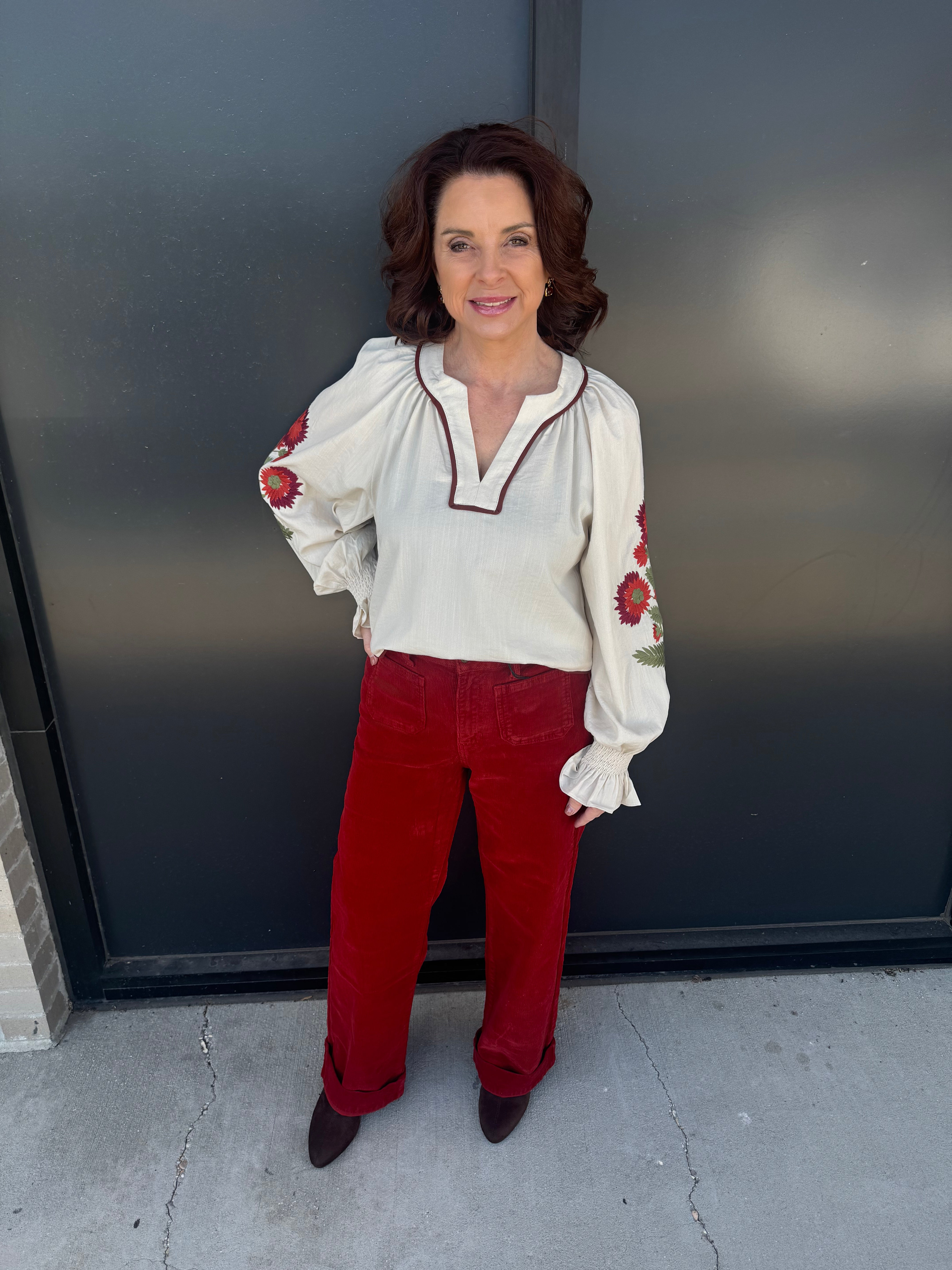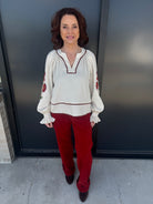 Add a touch of romance to your wardrobe with this solid long puff sleeve top, featuring delicate floral embroidery along the sleeves and contrast piping at the neckline and waist for a chic finish. The smocked cuffs with ruffle edgesadd playful detail, while the lightweight woven fabric keeps it comfortable and non-sheer. Perfect for pairing with jeans, skirts, or tailored pants for both casual and dressy occasions.
