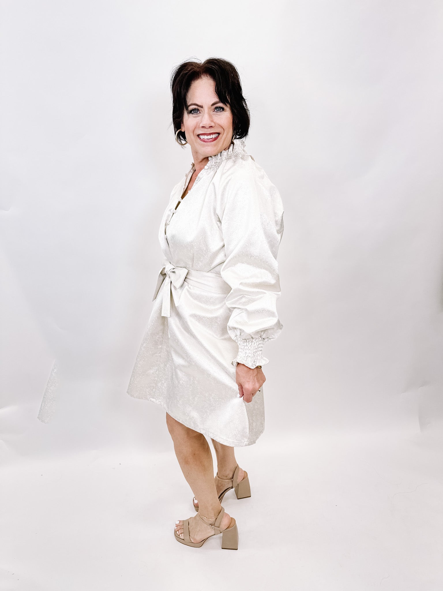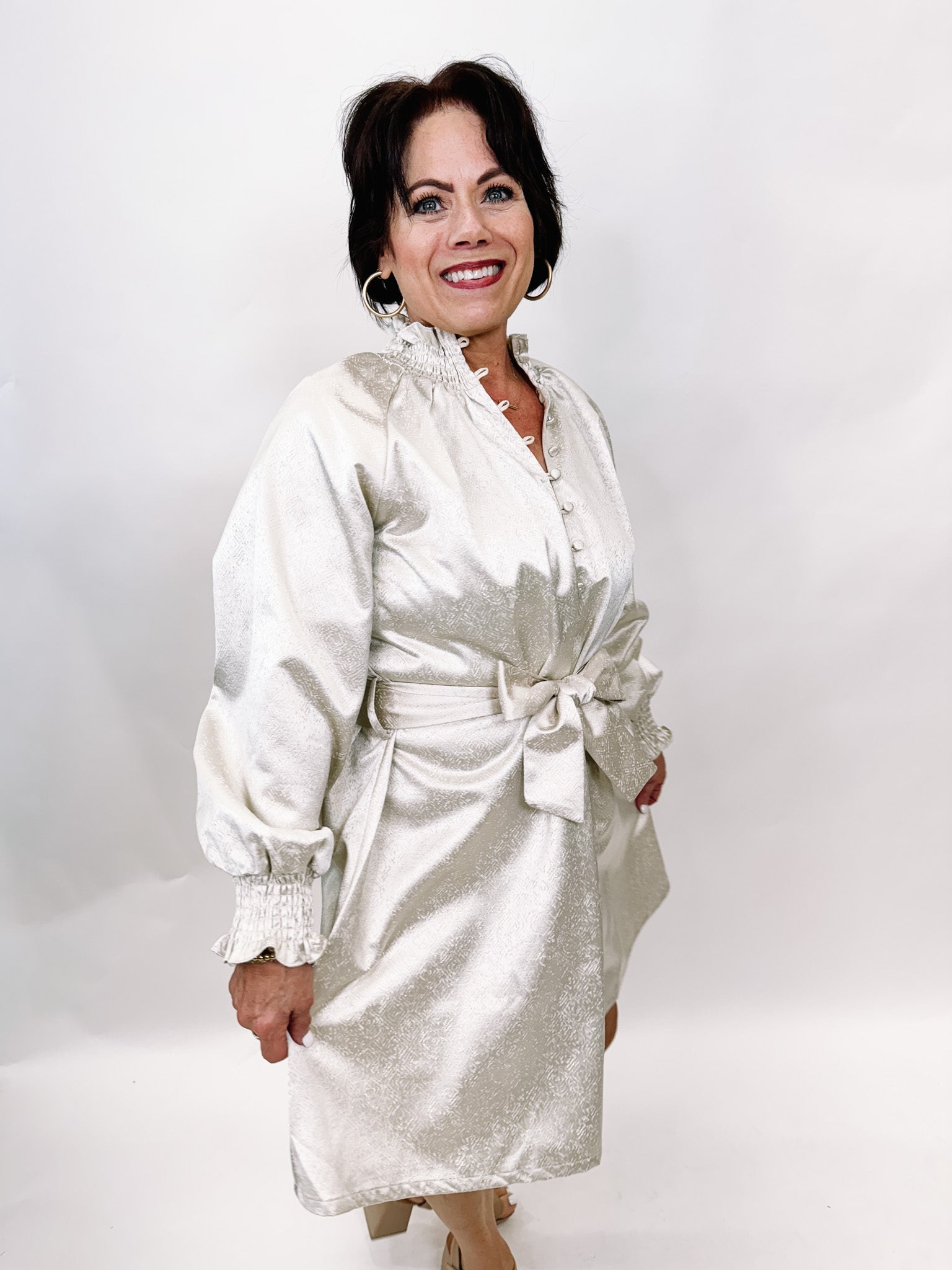 Indulge in the opulence of our Gally Dress. Made with shimmery gold brocade fabric, this dress features a high smocked neckline and fabric covered buttons. The included belt cinches the waist for a luxurious and sophisticated look. Elevate your style with this dress and make a statement at any event.