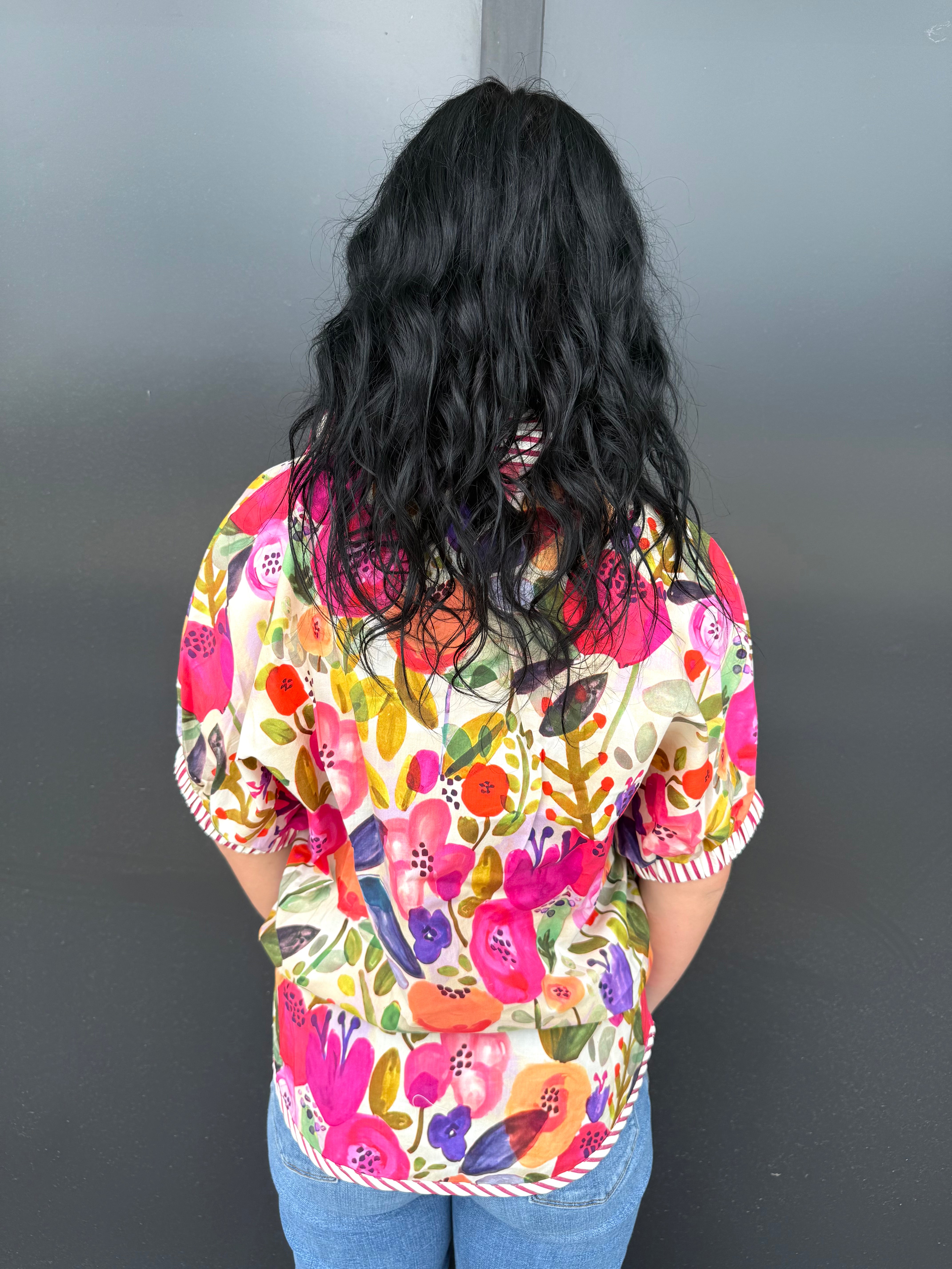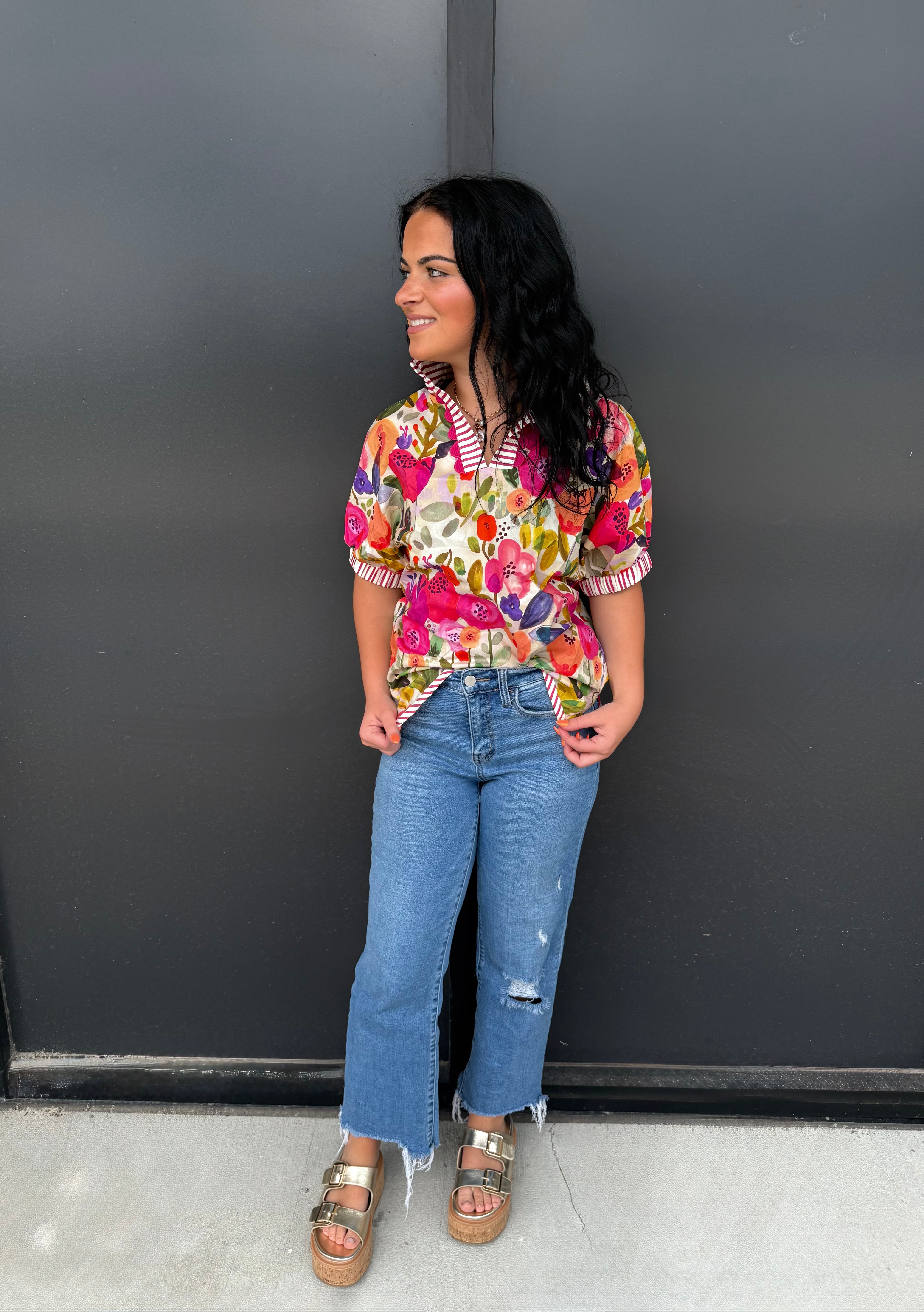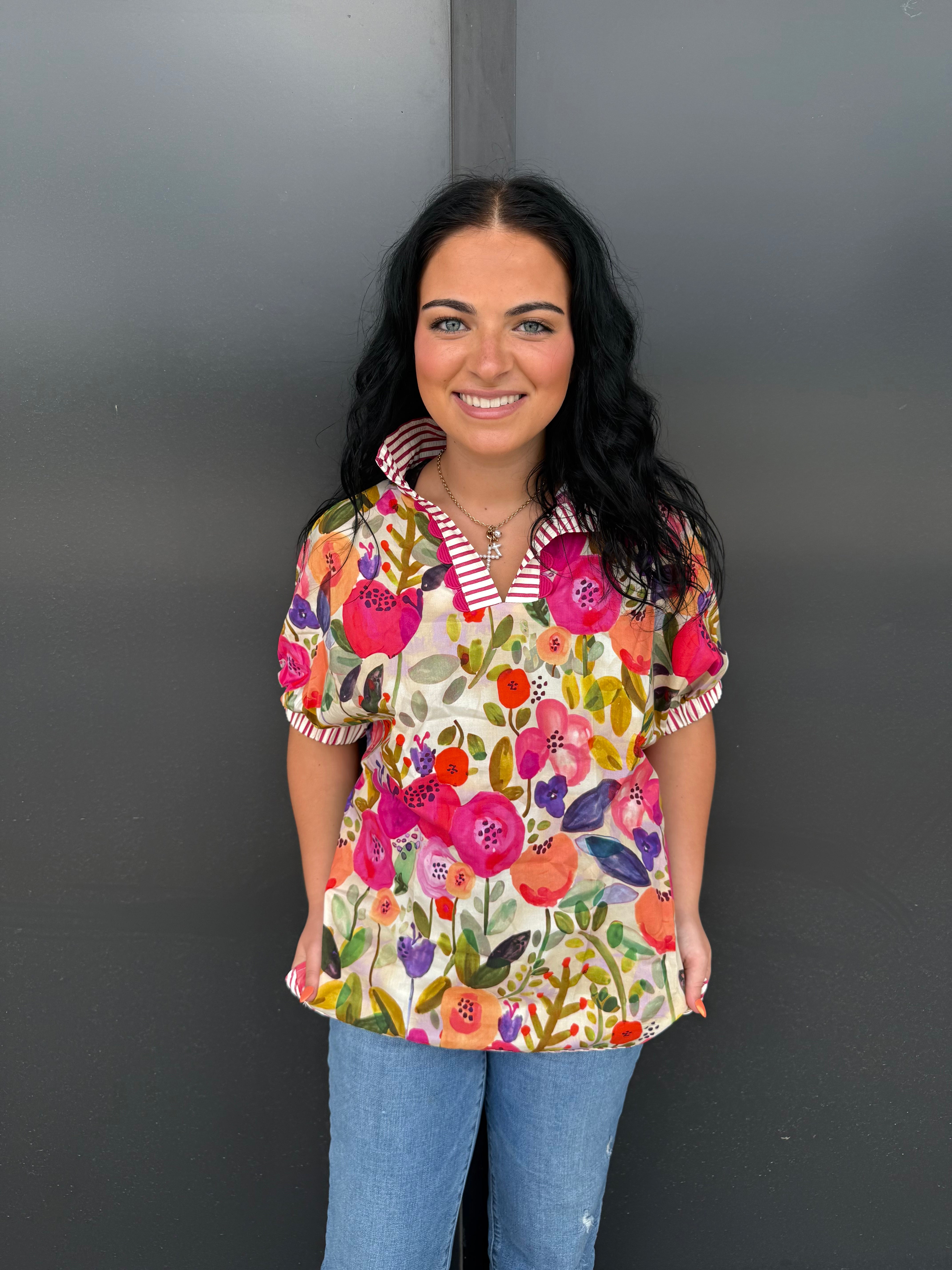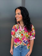 Add a splash of fun to your wardrobe with the Gigio Berrylicious Top! This charming blouse features a playful striped detail around the neck, accented by delicate scalloped trimming along the V-neckline. The vibrant berry floral print brings a fresh, lively vibe, while elastic striped cuffs and hem ensure a comfy, flattering fit. Perfect for brightening any day, this top is a must-have essential for your closet.