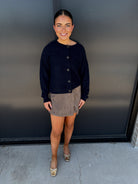Elevate your wardrobe with the Jinny Studded Skort, crafted from soft twill suede for a luxurious feel. This mini wrap skort features subtle studded accents, adding a refined edge to the classic silhouette. Its versatile design combines the comfort of shorts with the chic appearance of a skirt, perfect for sophisticated day-to-night looks.