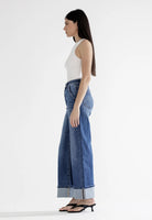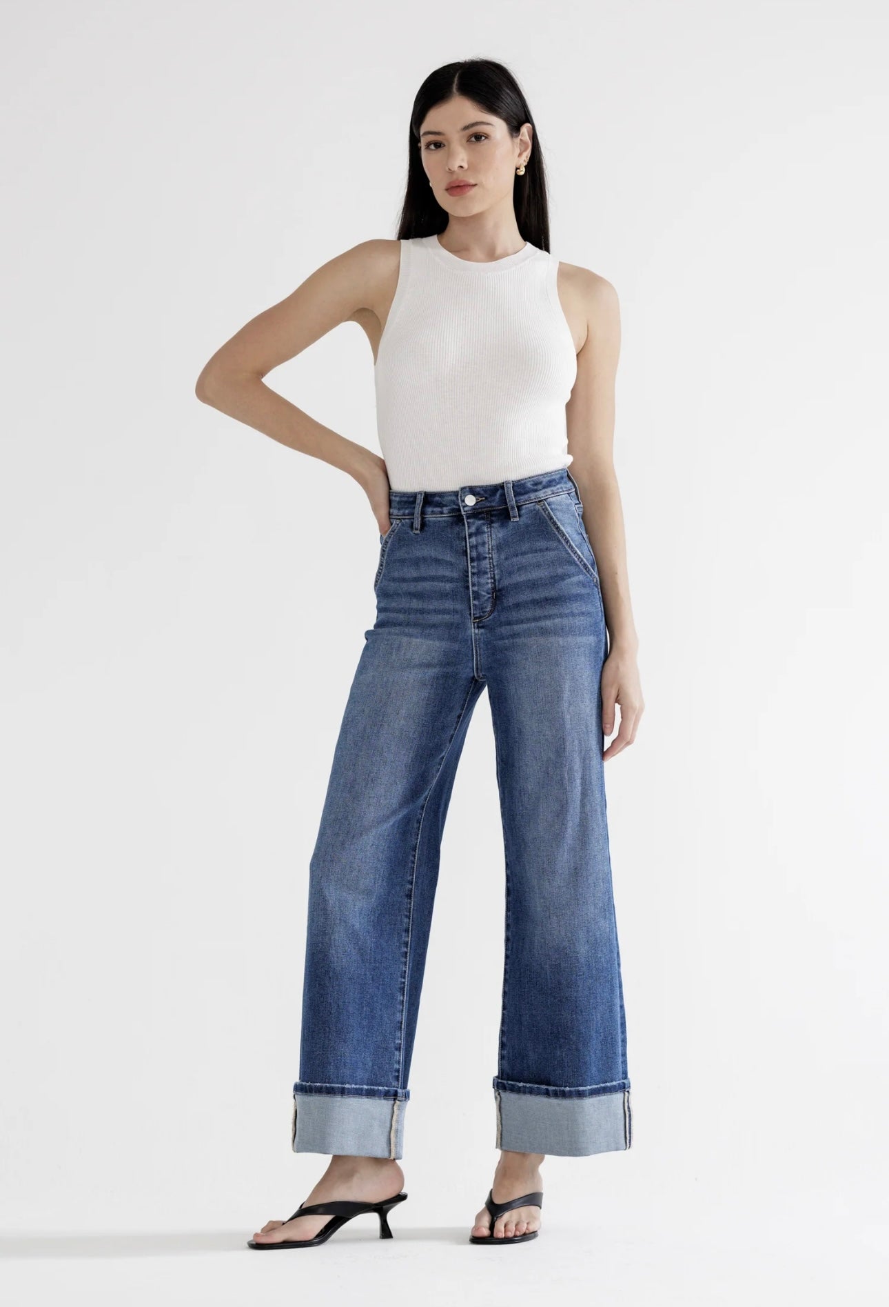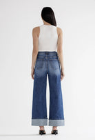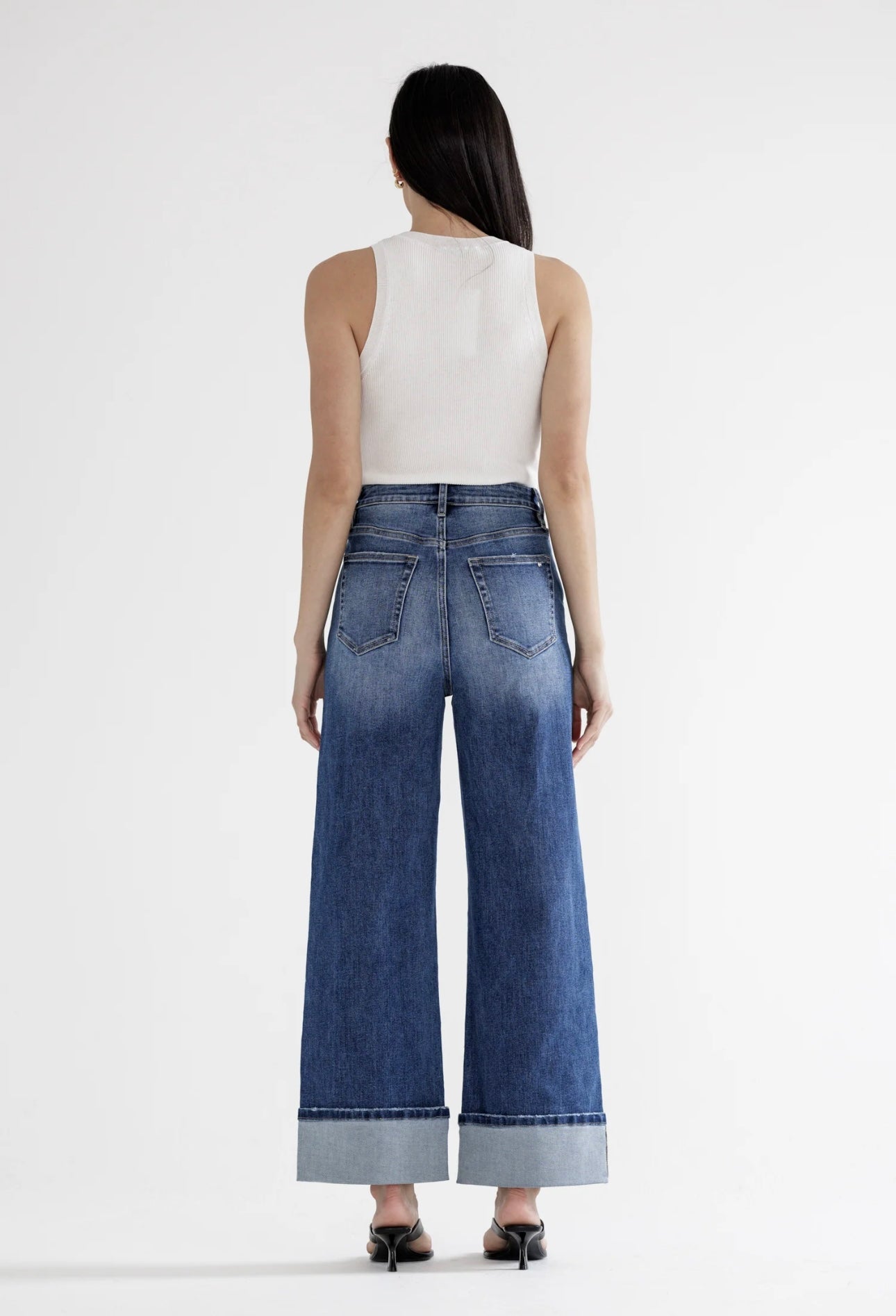 Elevate your denim game with our MD HR wide cuffed demin. Crafted from luxurious Mica denim, these pants feature a super high rise for a flattering silhouette and a wide leg design with cuffed hems. The hidden button adds a touch of sophistication to this premium piece.