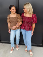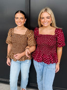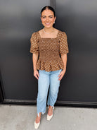 This puff half sleeve top features a delicate polka dot pattern and a woven fabric that combines comfort with timeless style. The smocked bodice offers a tailored fit, while the peplum hem adds a refined silhouette, perfect for elevating both casual and dressier looks with understated elegance.
